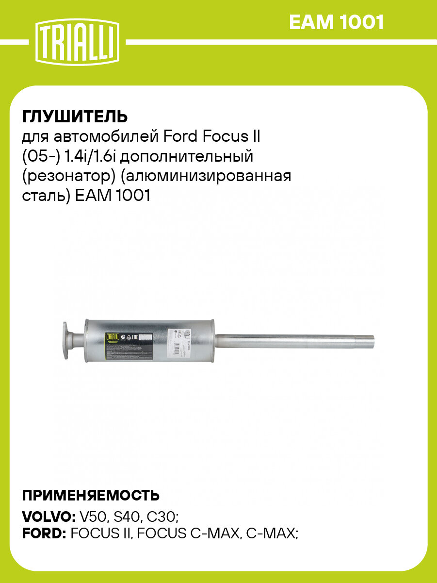 Купить Глушитель для автомобилей Ford Focus II (05-) 1.4i/1.6i дополнительный (резонатор) (алюминизированная сталь) EAM 1001 TRIALLI с доставкой по всей России.