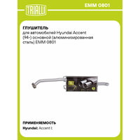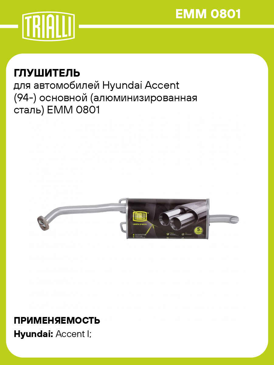 Глушитель для автомобилей Hyundai Accent (94-) основной (алюминизированная сталь) EMM 0801 TRIALLI: сравнение цен, характеристики, фото, актуальное наличие и цены.