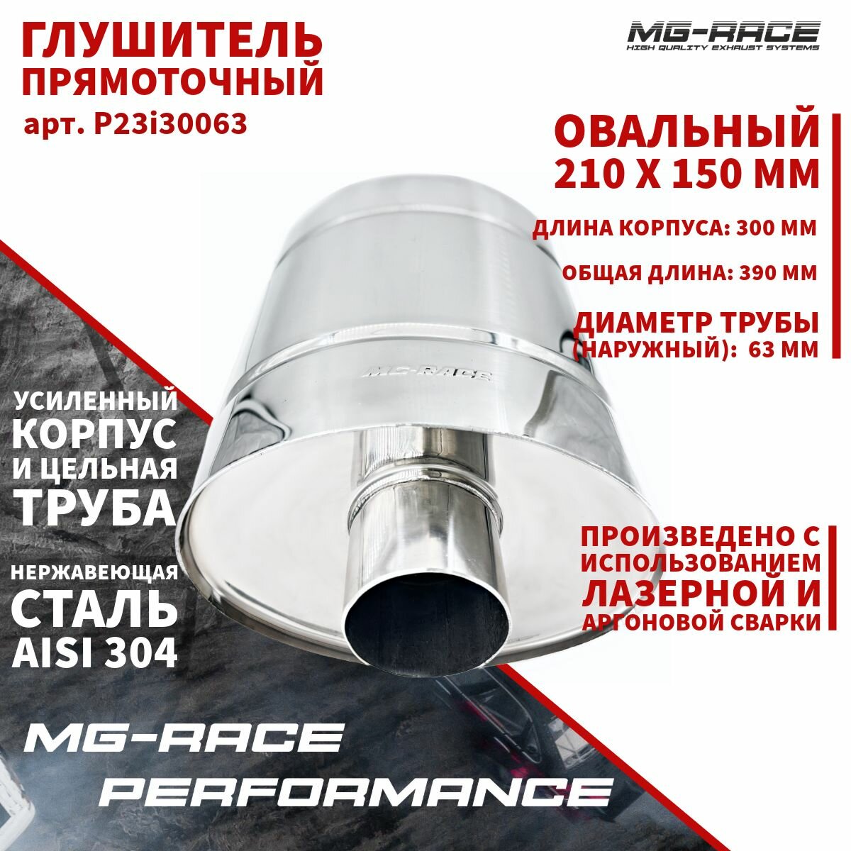 Купить Глушитель прямоточный Овал 210х150 x 300×63 мм, MG-Race Performance, длина 300 мм, труба 63 мм. нерж. сталь AISI 304 с доставкой по всей России.