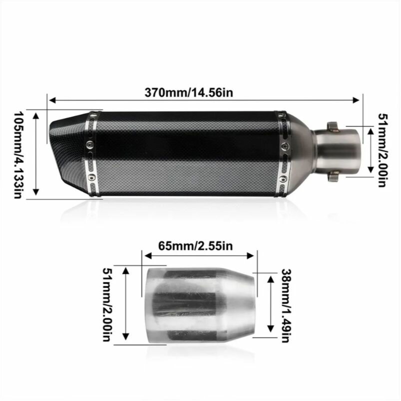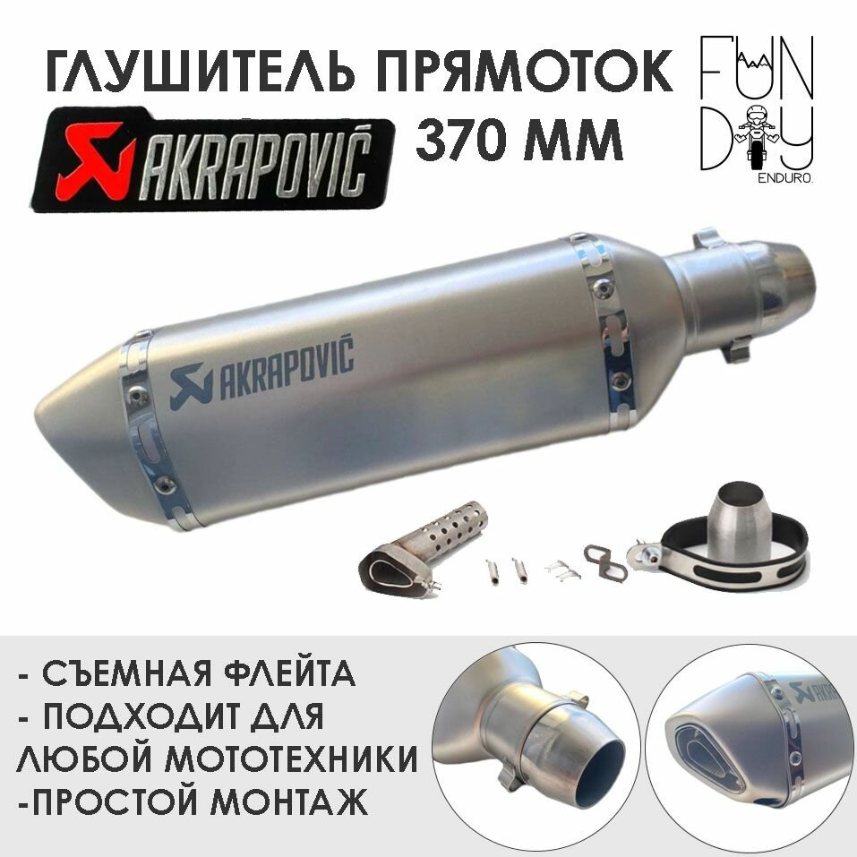 Глушитель имеет длину 370 мм, что позволяет легко его устанавливать и обслуживать. В комплект входят все необходимые компоненты для установки глушителя, включая адаптер для труб диаметром 31-55 мм, хомут, крепёжные элементы и пружины для фиксации. Глушитель также оснащён съёмным db киллером (флейтой), который позволяет регулировать уровень шума.