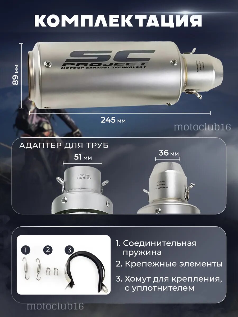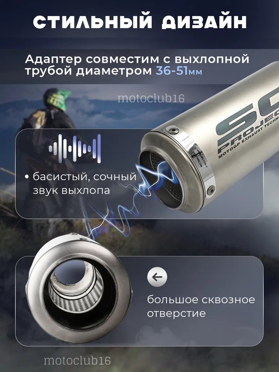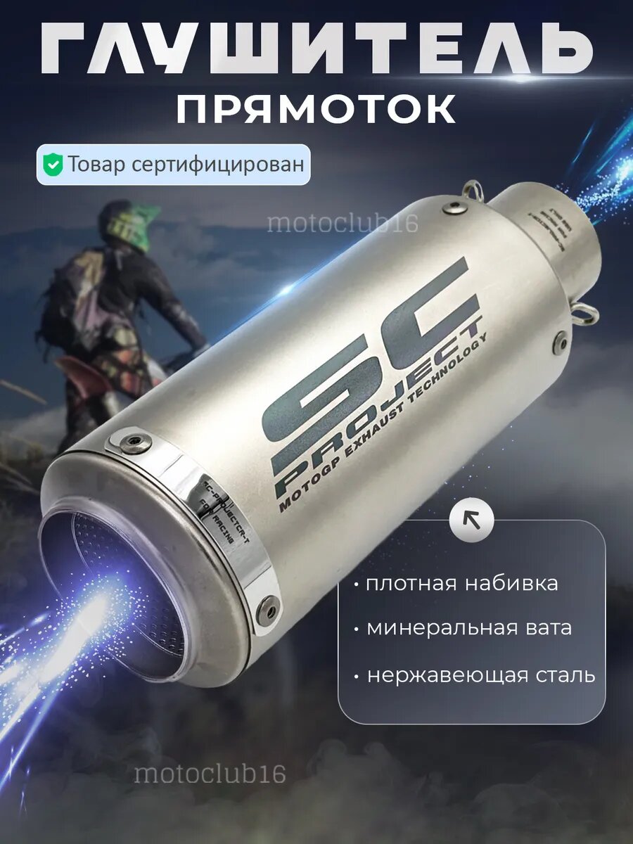 Прямоточный глушитель — аксессуар для мотоцикла, мопеда, питбайка, скутера или квадроцикла. Высококачественная реплика ск проджект. Sc project для любой модели мототехники, имеющей выхлопную трубу диаметром 35 -51 мм, будь то классический, кроссовый, спорт или пит байк. В комплект входят: адаптер для труб 35-51 мм, хомут, крепежные элементы, две пружины для фиксации. Банка имеет длину 24,5 см и ширину 8,9 см. Изготовлена из высококачественной нержавеющей стали, лазерная гравировка, плотная набивка из минеральной ваты. Дизайн мото банки подчеркнет индивидуальность и стиль. Прямоток scproject оснащен новейшими разработками и обеспечивает басистый, сочный звук выхлопа. Каждая банка поставляется в индивидуальной упаковке, тщательно проверяется перед отправкой. Подарок для любителей мотоциклов на 23 февраля. Подойдет на питбайки Kayo, Alpha, Irbis, Kawasaki, ямаха и другие. Сможете порадовать любимого, парня, папу или мужа. Наш магазин сотрудничает только с ответственными производителями, предлагающими высококачественные товары. Приобретая банку у нас, Вы можете быть уверены, что получите продукт, который превзойдет Ваши ожидания. Этот и другие аксессуары для мотоцикла Вы можете найти в нашем магазине motoclub16, перейдя во все товары.