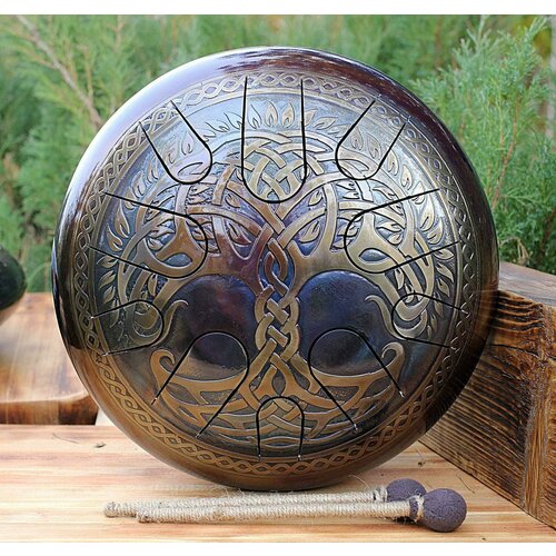 Дизайн наших стальных барабанов этой серии реализован за счет красивой гравировки, ручного обжига и покрытия защитным слоем лака. Широкий каталог гравировок и настроек звука делает наши инструменты особенно привлекательными по сравнению с работами других мастерских.