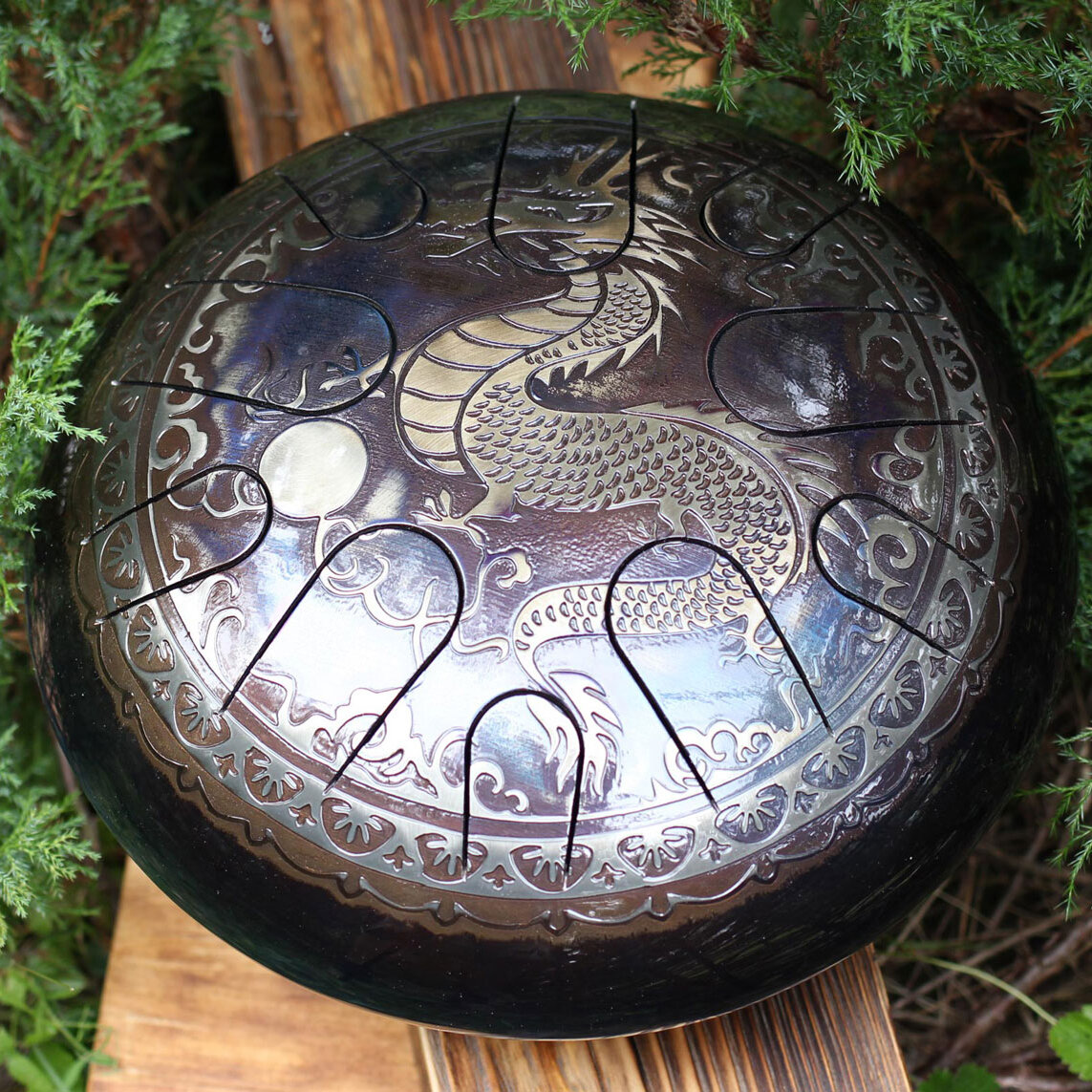 Дизайн наших стальных барабанов этой серии реализован за счет красивой гравировки, ручного обжига и покрытия защитным слоем лака. Широкий каталог гравировок и настроек звука делает наши инструменты особенно привлекательными по сравнению с работами других мастерских.