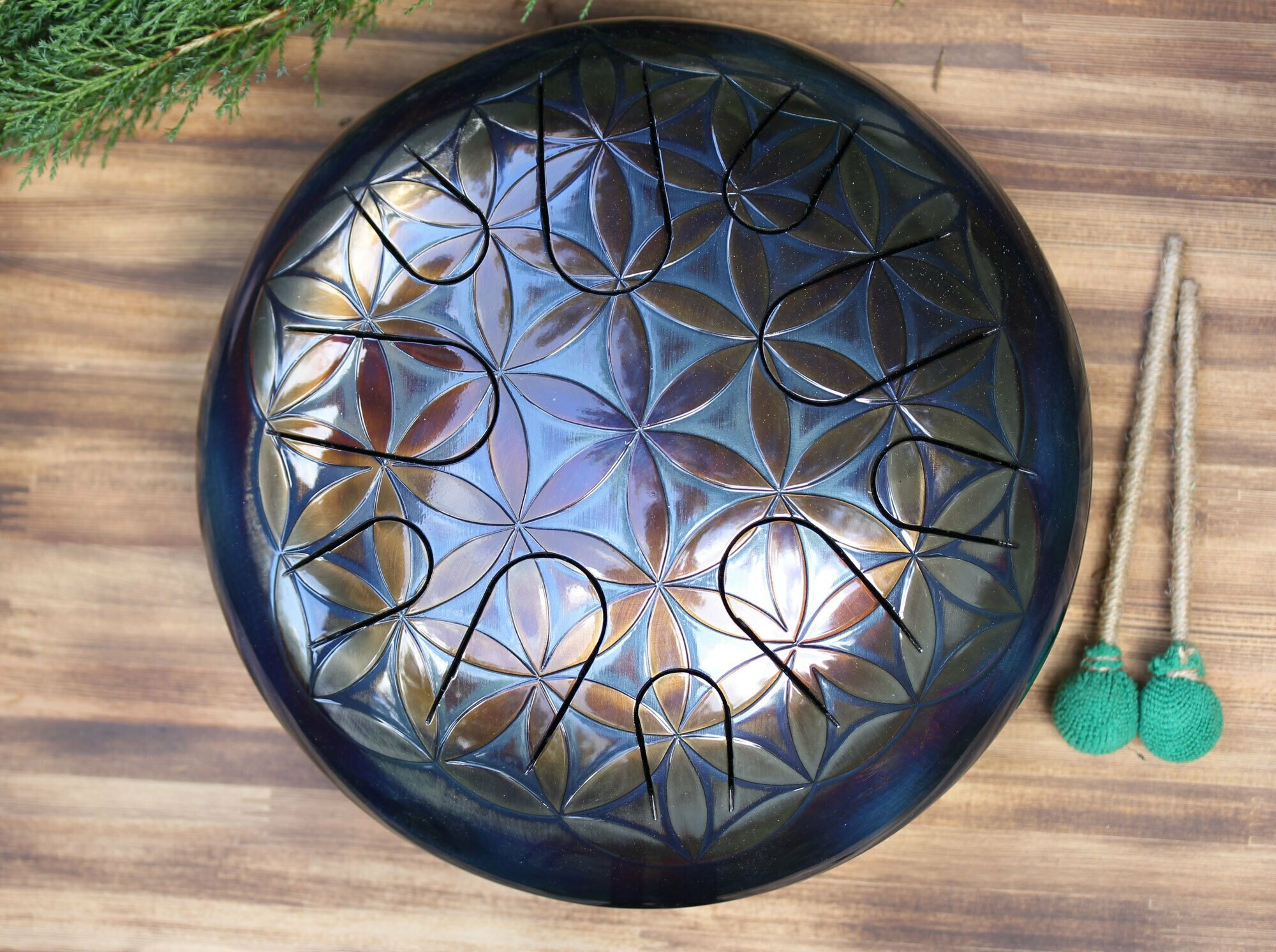 Дизайн наших стальных барабанов этой серии реализован за счет красивой гравировки, ручного обжига и покрытия защитным слоем лака. Широкий каталог гравировок и настроек звука делает наши инструменты особенно привлекательными по сравнению с работами других мастерских.