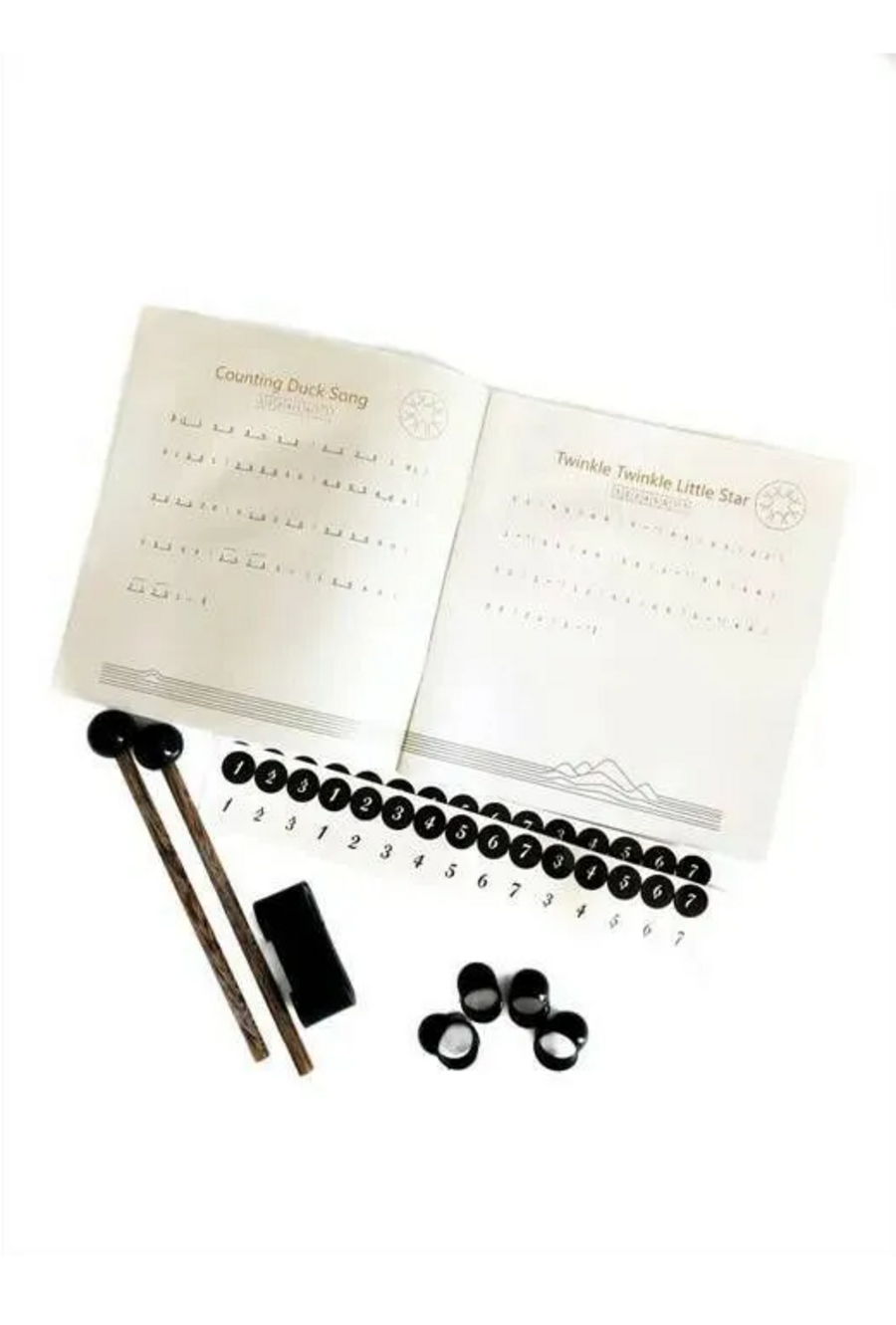 В комплекте имеются бамбуковые палочки, а также книжка с нотами различных музыкальных мелодий, в книжке вы можете увидеть 23 мелодии различной сложности, которые позволят вам быстро научиться играть, так как на глюкофоне каждый лепесток пронумерован.