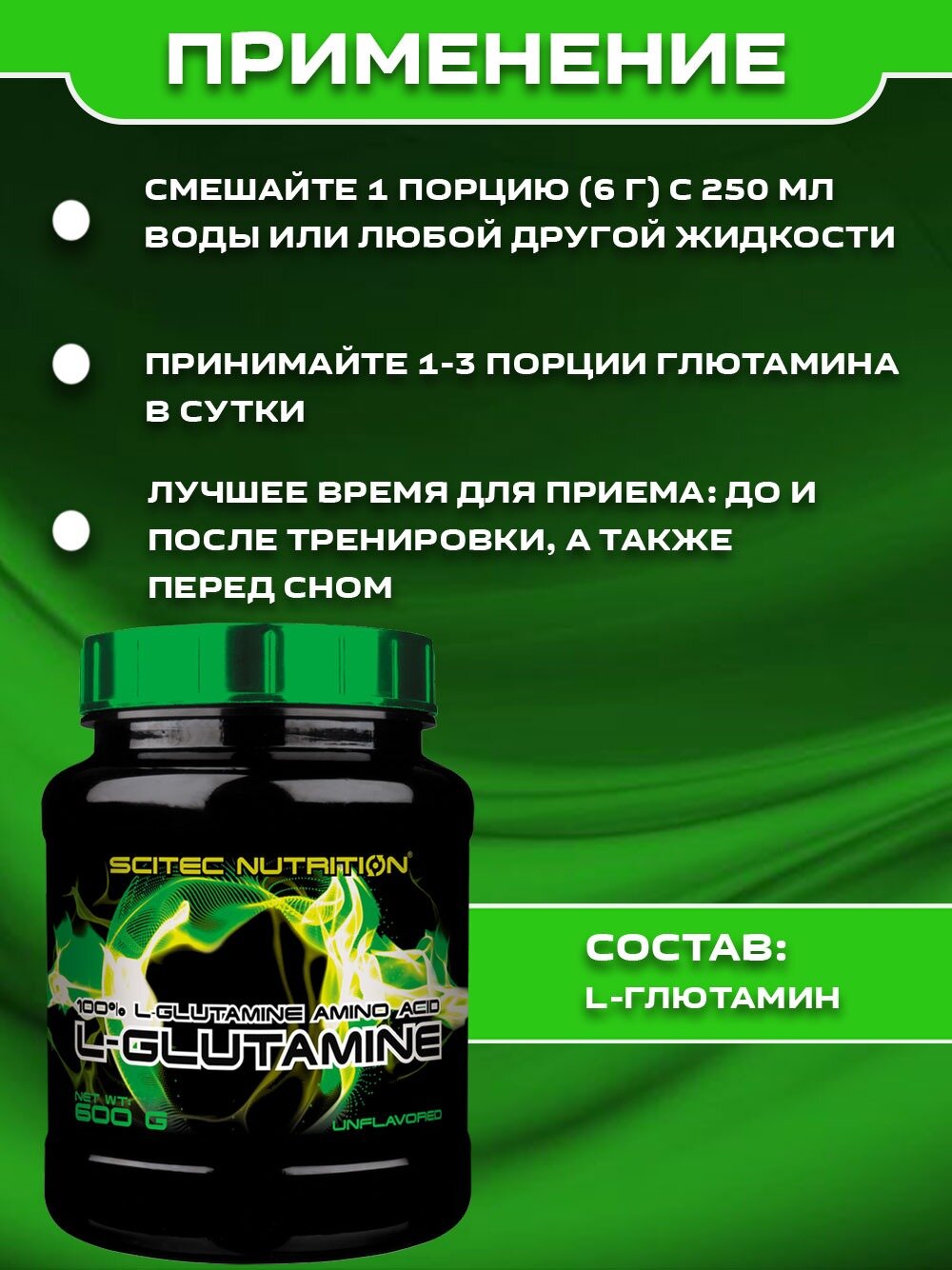 L-Glutamine Scitec Nutrition - спортивная добавка, содержащая глютамин - одну из важнейших аминокислот. L-Glutamine обеспечит вас достаточным запасом глюкогена для поддержания иммунитета и здоровья. Глютамин при достаточных количествах в организме блокирует выработку кортизона, чем сохраняет наращённую мышечную массу и благотворно влияет на ее дальнейший рост. L-Glutamine защищает печень от токсических веществ, способствует выведению шлаков из организма, участвует в выработке гормона роста. Как принимать глютамин Принимайте по 1-3 порции глютамина в сутки. Лучше время для приема до и после тренировки, также перед сном.