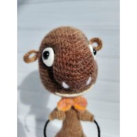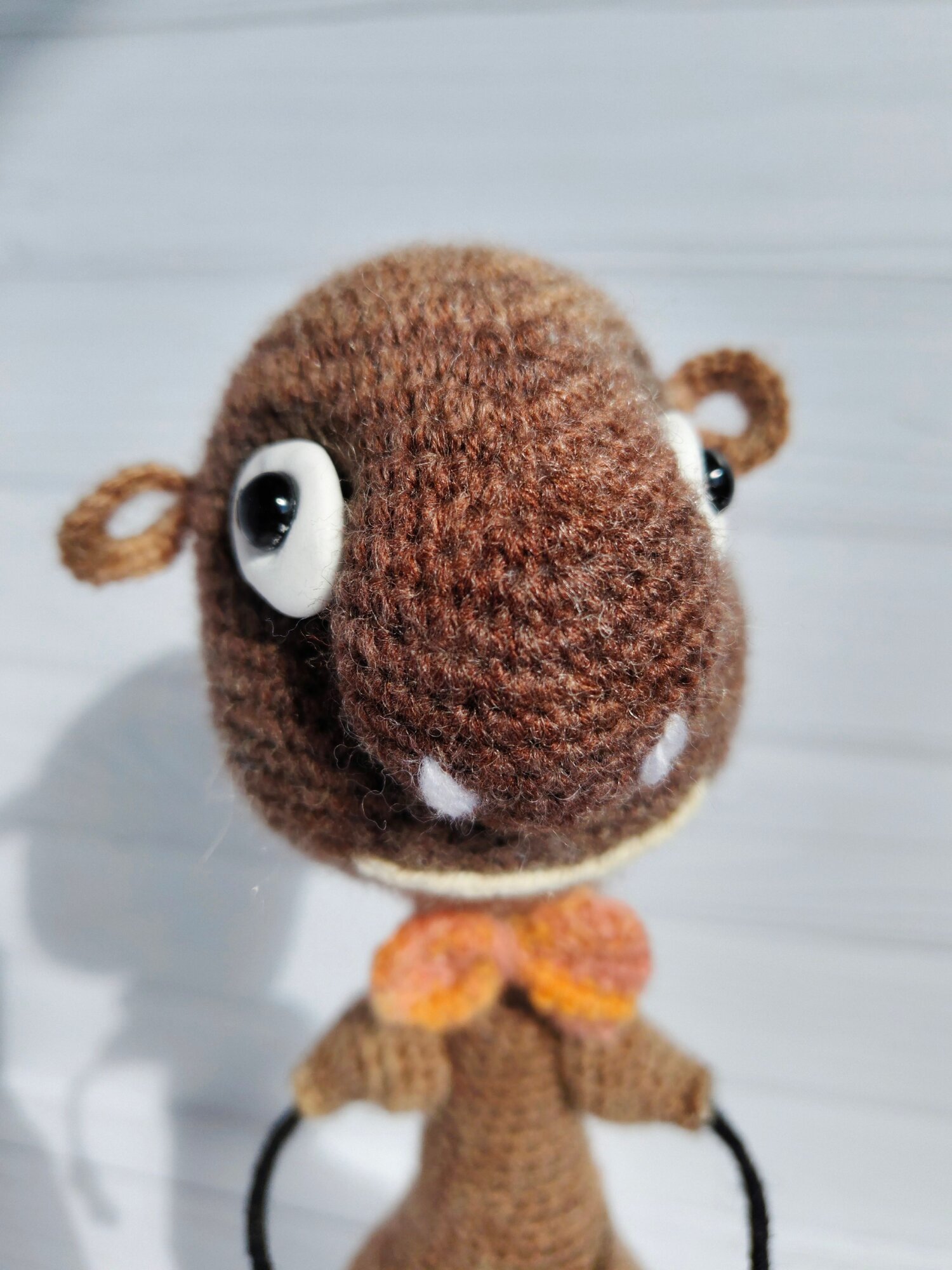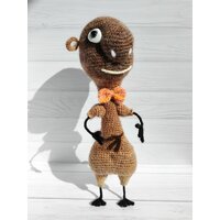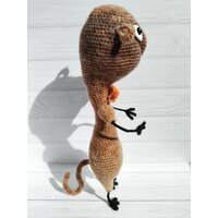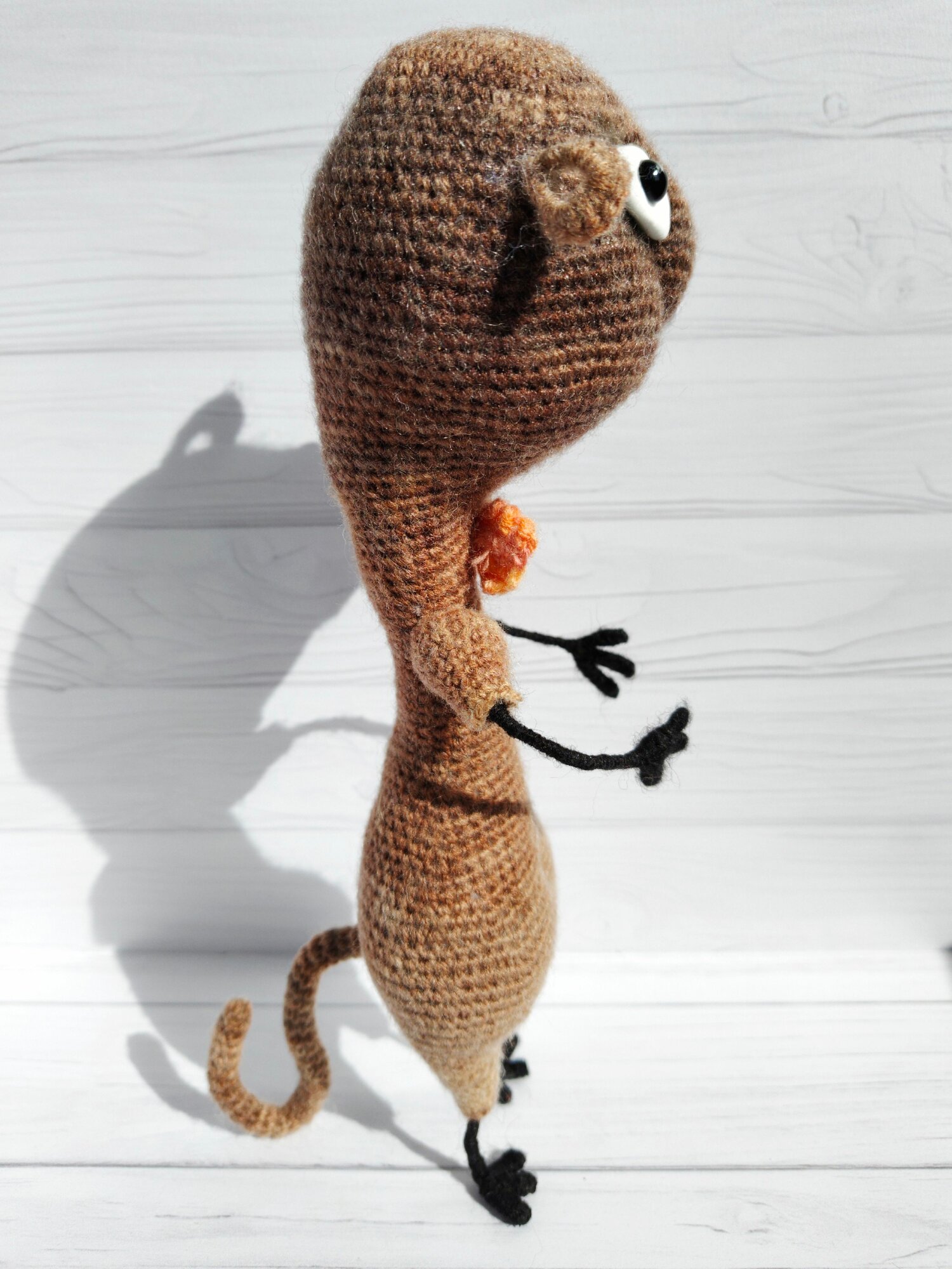 Игрушка выполнена в виде суриката, связанного крючком, что придает ей особую теплоту и уют.