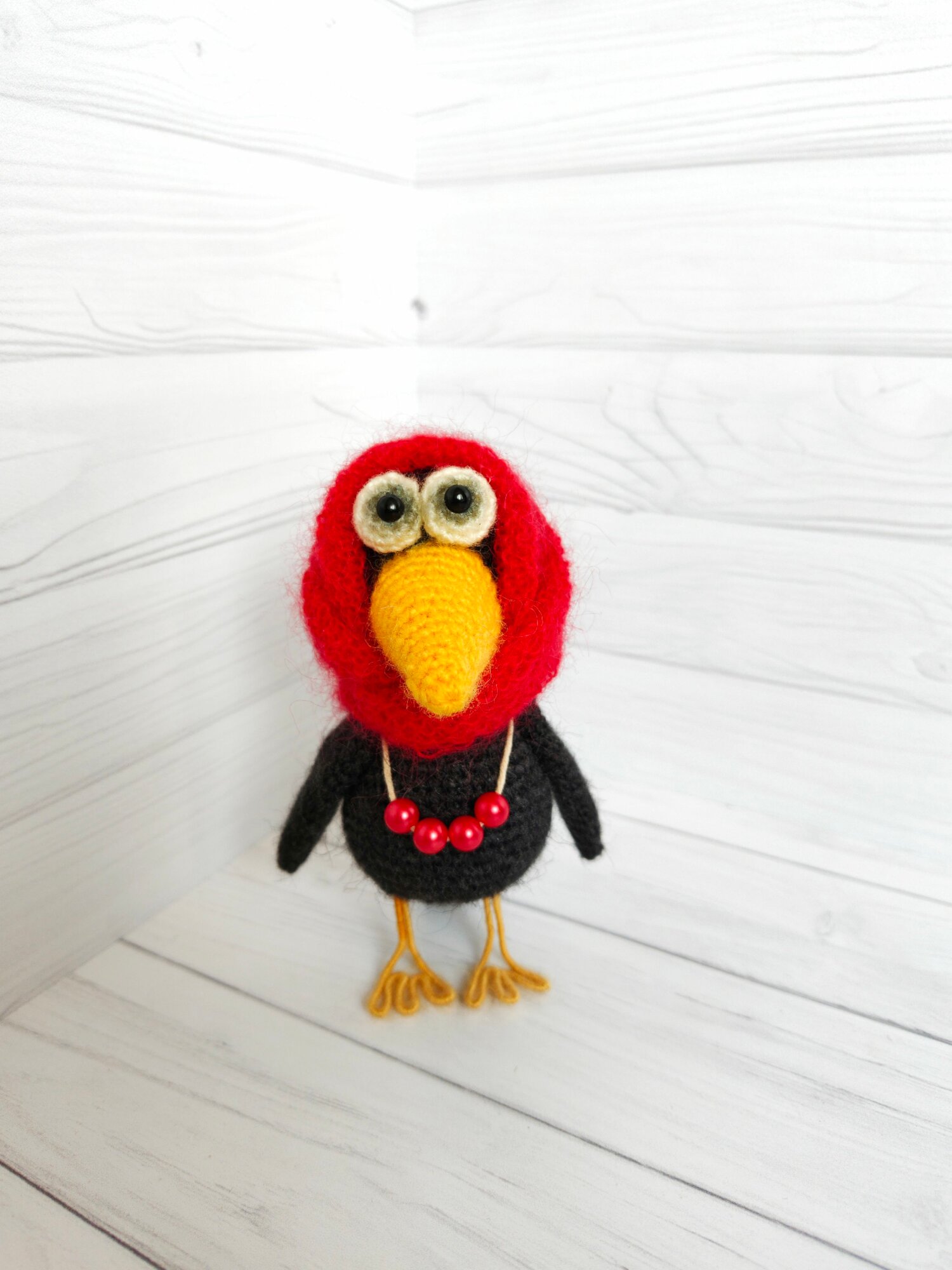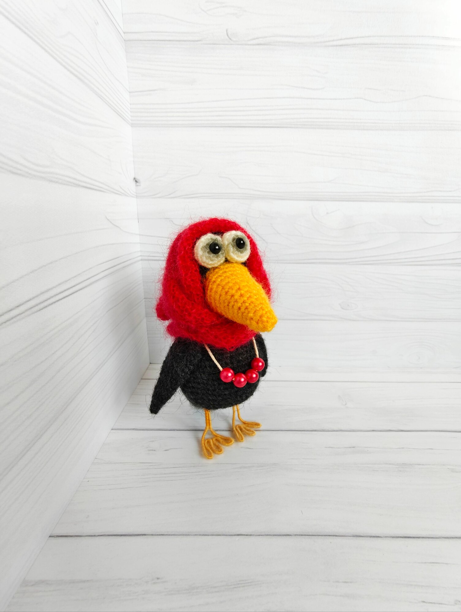 Гнущаяся вязаная игрушка на каркасе ручной работы "Ворона в красном платке с бусами" от бренда ЯнаART - это уникальное и стильное украшение для вашего интерьера.