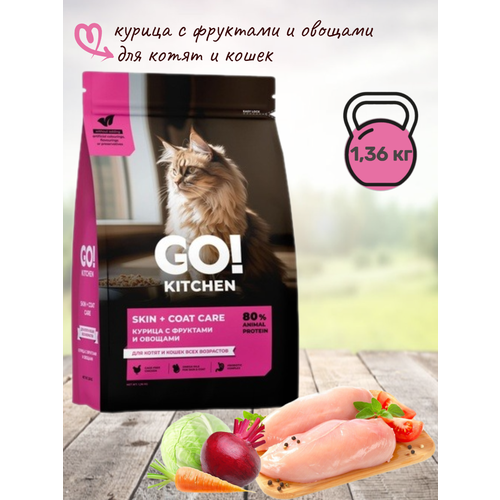 Сухой корм для котят и кошек Go! Kitchen Skin + Coat Care Chicken с цыпленком – это сбалансированное питание Холистик класса, содержащее все необходимое для здоровья и долголетия. Корм производится из курицы (основной ингредиент) в сочетании с коричневым рисом, овсянкой, куриными яйцами, яблоками и клюквой. Рецептура разработана ветеринарными диетологами для того, чтобы дать кошкам профилактический уход, который им нужен, чтобы оставаться сильным и здоровым. В составе корма Go содержатся антиоксиданты для поддержания иммунитета, омега для здоровой кожи и шерсти, а также витамины, минералы и незаменимый таурин. В нем даже есть пребиотики для мягкого пищеварения и антиоксиданты, такие как водоросли и люцерна. Кроме того, в этом корме нет побочных продуктов, гормонов, говядины, пшеницы, кукурузы или сои, поэтому он отлично подходит для кошек с пищевой аллергией или непереносимостью. Ключевые преимущества Подходит для котят, взрослых и пожилых кошек. Высокое содержание куриного белка для поддержания здоровых мышц и активности. Насыщен антиоксидантами для иммунитета и омега-3 жирными кислотами для поддержания здоровой и блестящей кожи и шерсти. Содержит пребиотические волокна для здорового пищеварения и «суперпродукты», такие как водоросли и люцерна для антиоксидантной поддержки. Состав Новый состав (Россия) Курица 54% (измельченное, дегидрированное мясо курицы, куриное мясо без костей, куриный жир, натуральный ароматизатор (бульон из курицы)), цельный неочищенный рис, бурый рис, овсяная мука, картофель, измельченное, дегидрированное мясо лосося, витамины и минералы, сушеный корень цикория, яблоки, морковь, клюква, льняное семя, люцерна, хлористый калий, лососевый жир, цельные сушеные куриные яйца, таурин, DL-метионин, фосфорная кислота, сушеный розмарин, экстракт юкки Шидигера, пробиотический комплекс (B.subtilis, B.licheniformis), экстракт токоферола природного происхождения (антиоксидант) Белки 32% Жиры 20% Клетчатка 2,5% Влага 8% Зола 7% Кальций 1,1% Фосфор 0,9% Магний 0,1% Таурин 0,2% Омега-6 3,2% Омега-3 0,5% Калорийность 408 ккал/100г Пищевые добавки на кг: ретинола ацетат 25000 МЕ, токоферола ацетат 300 мг, холекальциферол 1700 МЕ, холин хлорид 3400 мг, L-аскорбат-2-фосфат 70 мг, пантотенат кальция 20 мг, ниацин 80 мг, таурин 1800 мг, сульфат железа моногидрат 50 мг, аминокислотный хелат железа гидрат 20 мг, йодат кальция безводный 3 мг, сульфат меди пентагидрат 11 мг, сульфат марганца моногидрат 14 мг, аминокислотный хелат марганца гидрат 4 мг, сульфат цинка моногидрат 115 мг, аминокислотный хелат цинка гидрат 35 мг, селенит натрия 0,2 мг. Старый состав (Франция) Куриная мука, очищенная от костей курица, цельный коричневый рис, белый рис, овсяная каша, куриный жир (консервированный со смешанными токоферолами), лососевая мука, натуральный куриный вкус, яблоки, морковь, картофель, клюква, льняное семя, цельное вяленое яйцо, лососевое масло, Люцерна, фосфорная кислота, хлор