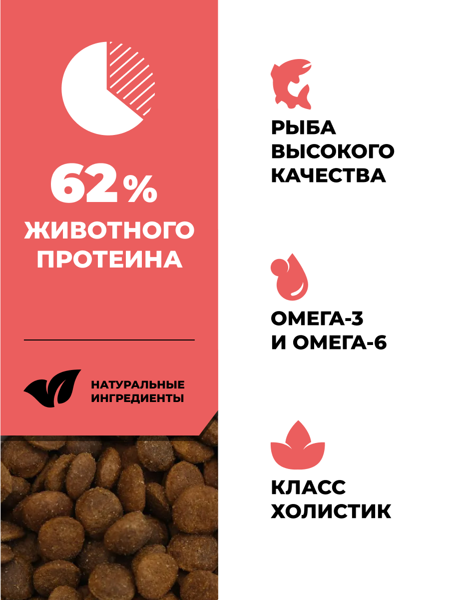 - Лосось высшего качества в качестве источника рыбного белка в сочетании с уникальными углеводами