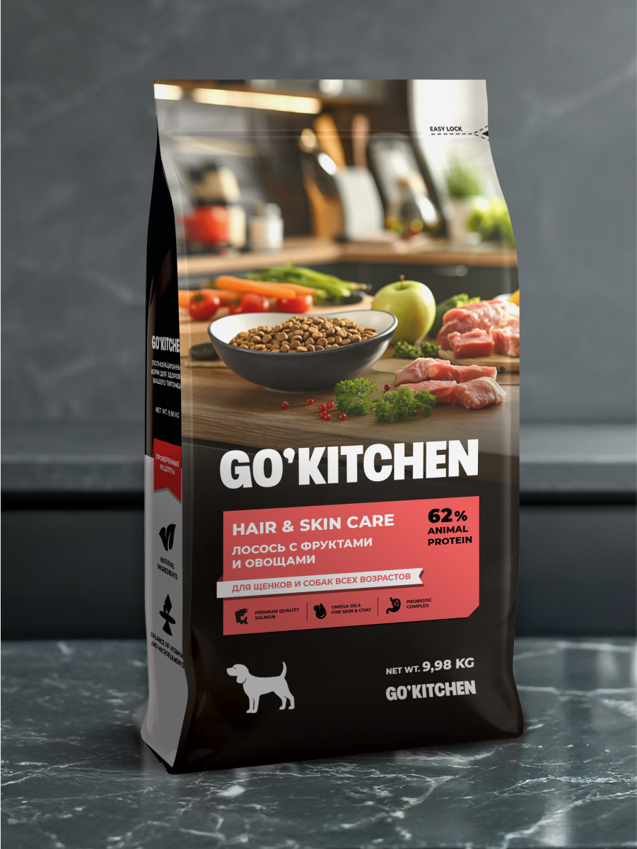 Сухой корм для собак Go! Kitchen Skin + Coat Care с лососем – это сбалансированное питание, насыщенное незаменимыми амино и омега-кислотами для поддержания здоровой кожи и блестящей шерсти. Основной ингредиент – натуральный лосось (Мука лосося). В составе корм Go! с лососем содержатся все необходимые витамины, минералы, антиоксиданты и пребиотики для правильной работы организма Вашего питомца. Соя, пшеница, кукуруза или побочные продукты не используются при производстве, что делает данный корм подходящим для многих аллергичных собак