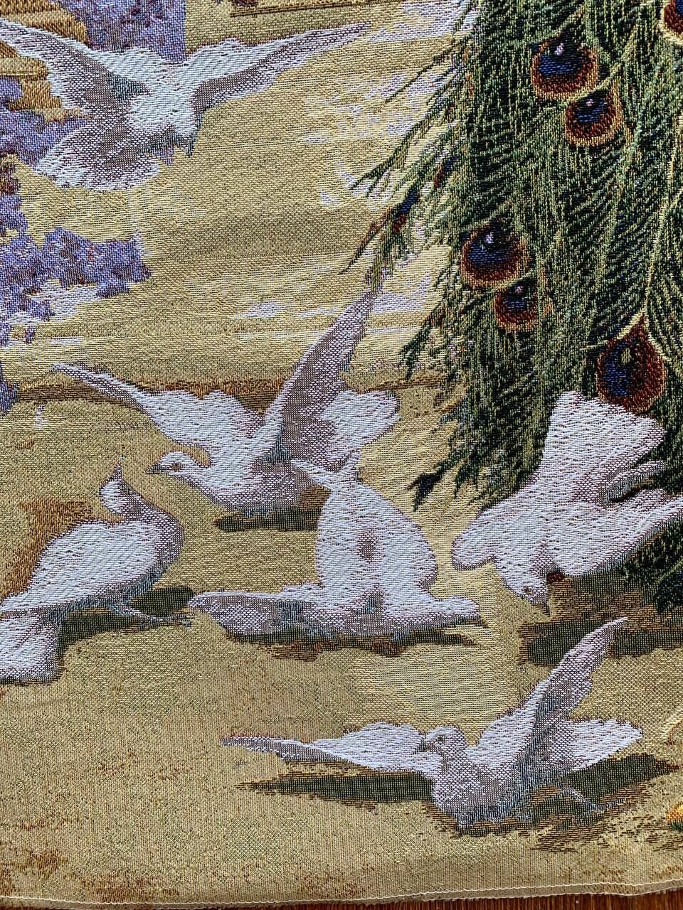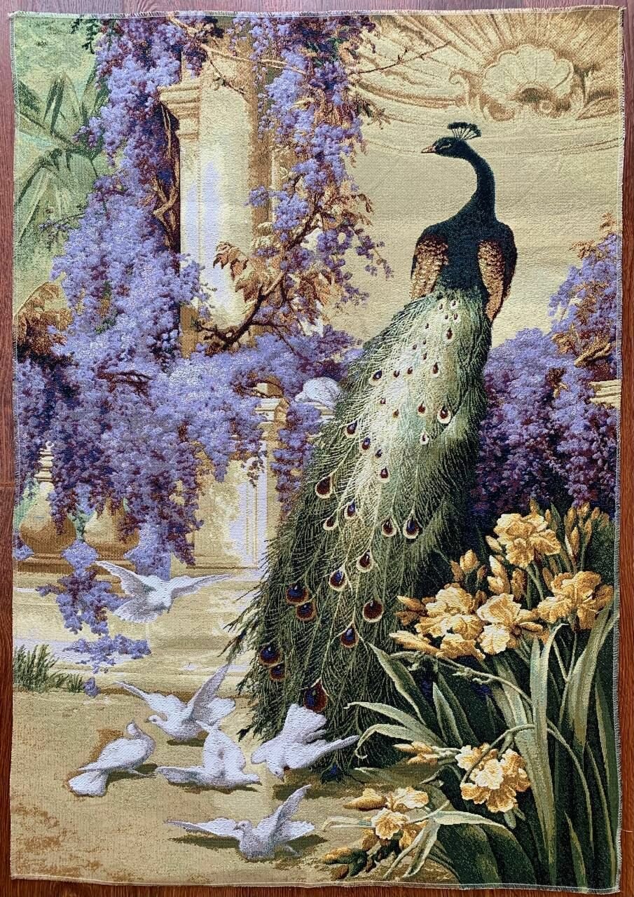 Великолепный гобелен с изображением павлина в райском саду, размер: 105х70 см. (+- 2-3 см) станет отличным украшением вашего дома! Изображение павлина является талисманом фен-шуй, активизируют энергию славы, успеха и процветания. Голуби являются одним из главных атрибутов богини Афродиты (Венеры), со времен античности они символизируют любовь и постоянство, пара голубей — согласие, привязанность. Этот гобелен подойдет для интерьера в классическом стиле или в стилях фьюжн и ар-деко, а так же может быть красивым и эффектным подарком!