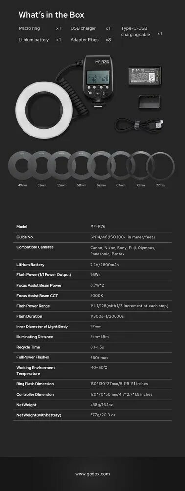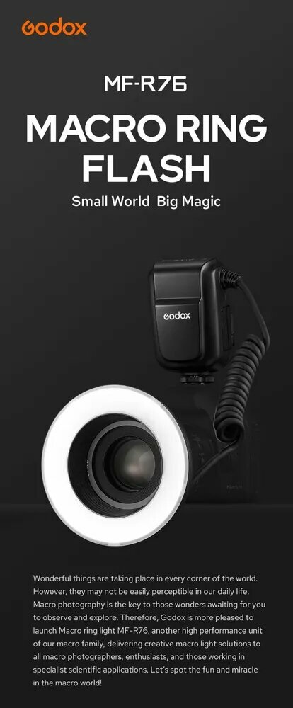 Godox MF-R76 5000K Macro LED Ring Flash Light для камеры Sony, Canon, Nikon: сравнение цен, характеристики, фото, актуальное наличие и цены.