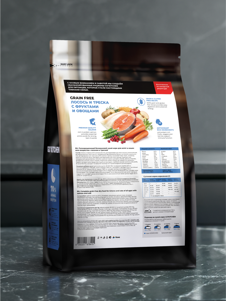 Купить GO’KITCHEN Беззерновой корм для котят и кошек всех возрастов с лососем, треской, фруктами и овощами, GRAIN FREE Salmon&CodFish, 1,36кг. с доставкой по всей России.