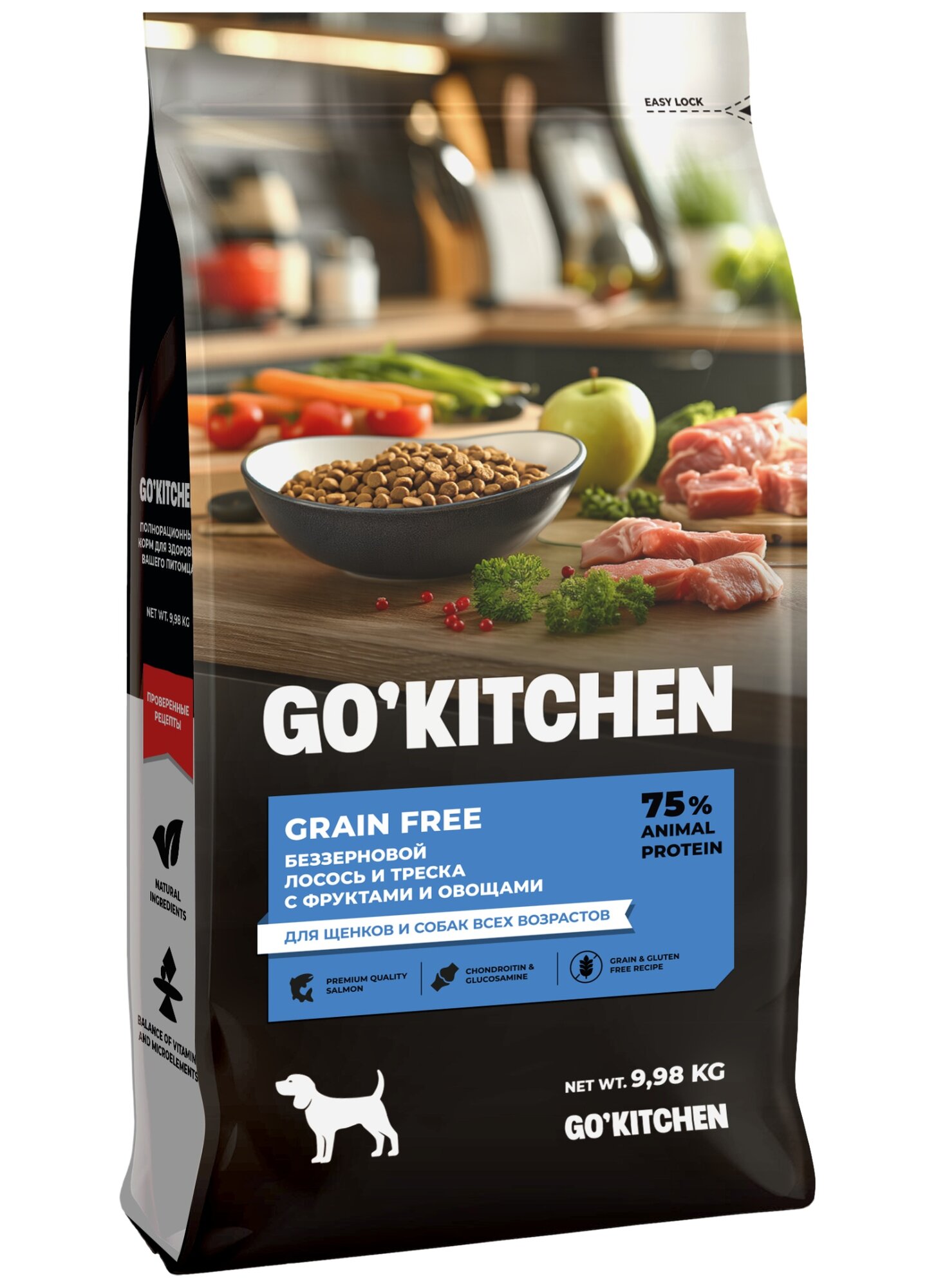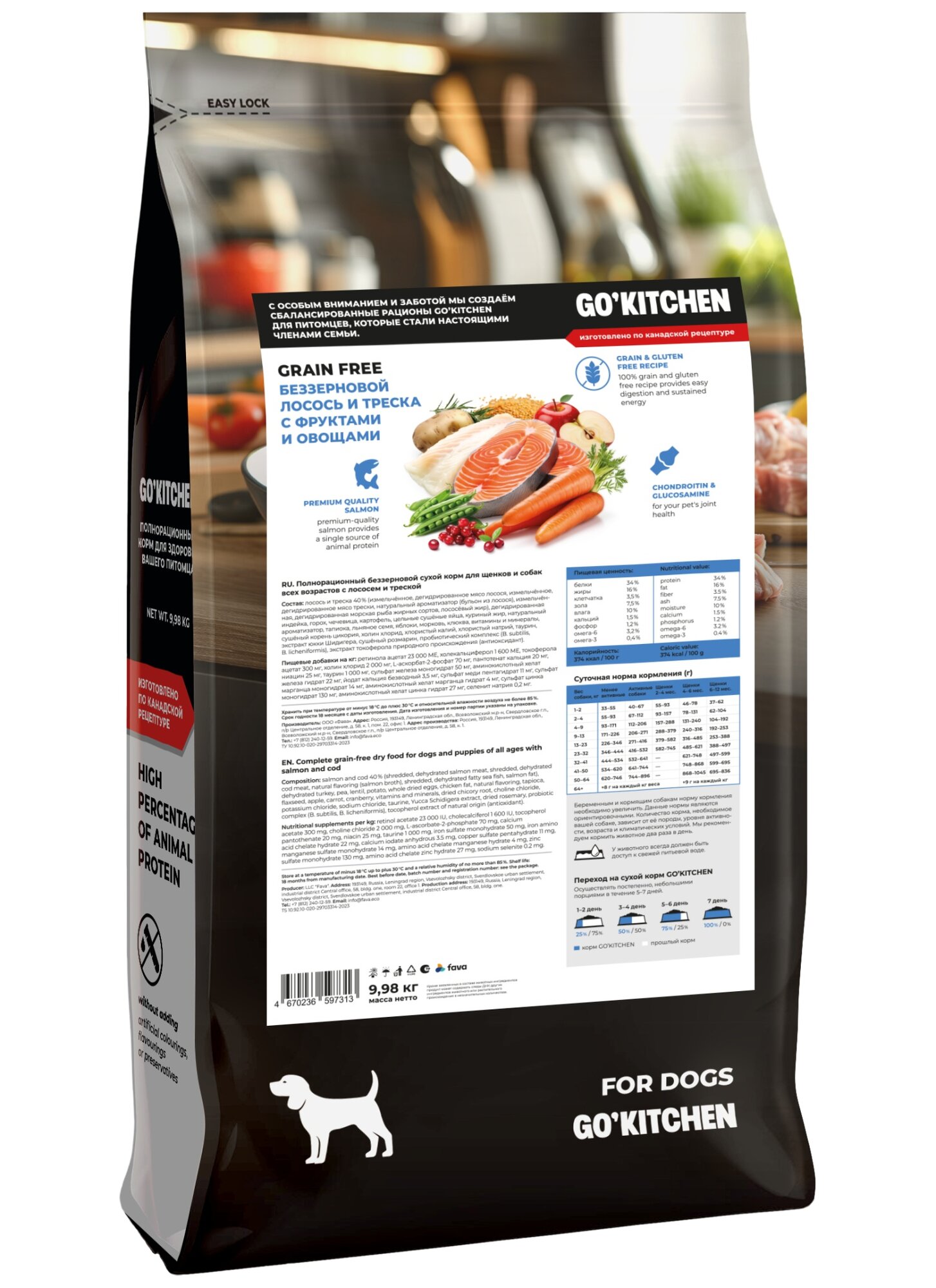 Go`Kitchen Беззерновой корм Для щенков и собак всех возрастов с лососем, треской, фруктами и овощами, GRAIN FREE Salmon&CodFish, 9.98кг: сравнение цен, характеристики, фото, актуальное наличие и цены.
