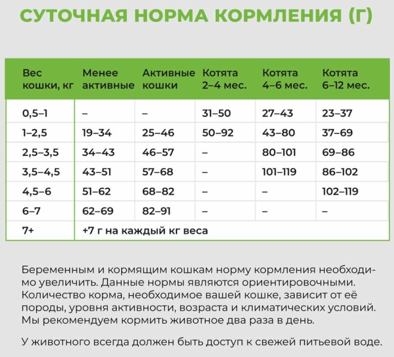Беременные / кормящие кошки: увеличение потребления на 50%.