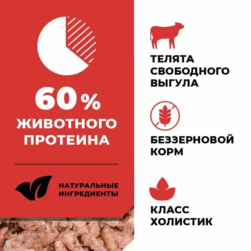 Монобелковый влажный корм с телятиной идеально подходит для питомцев с чувствительным пищеварением и склонностью к аллергии.
