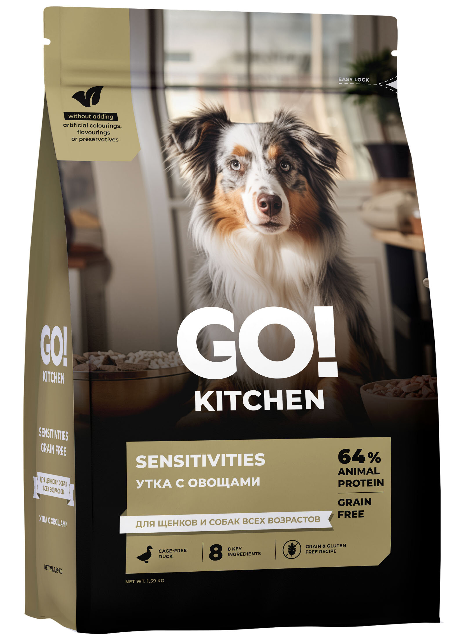 мясо утки, натуральный ароматизатор (бульон из утки)), горох, чечевица, тапиока, гороховая мука, нут, картофель, куриный жир, масло канолы, натуральный ароматизатор, витамины и минералы, лососевый жир, сушеный корень цикория, фосфат монокальция, хлористый натрий, таурин, сушеный розмарин, экстракт токоферола природного происхождения (антиоксидант)