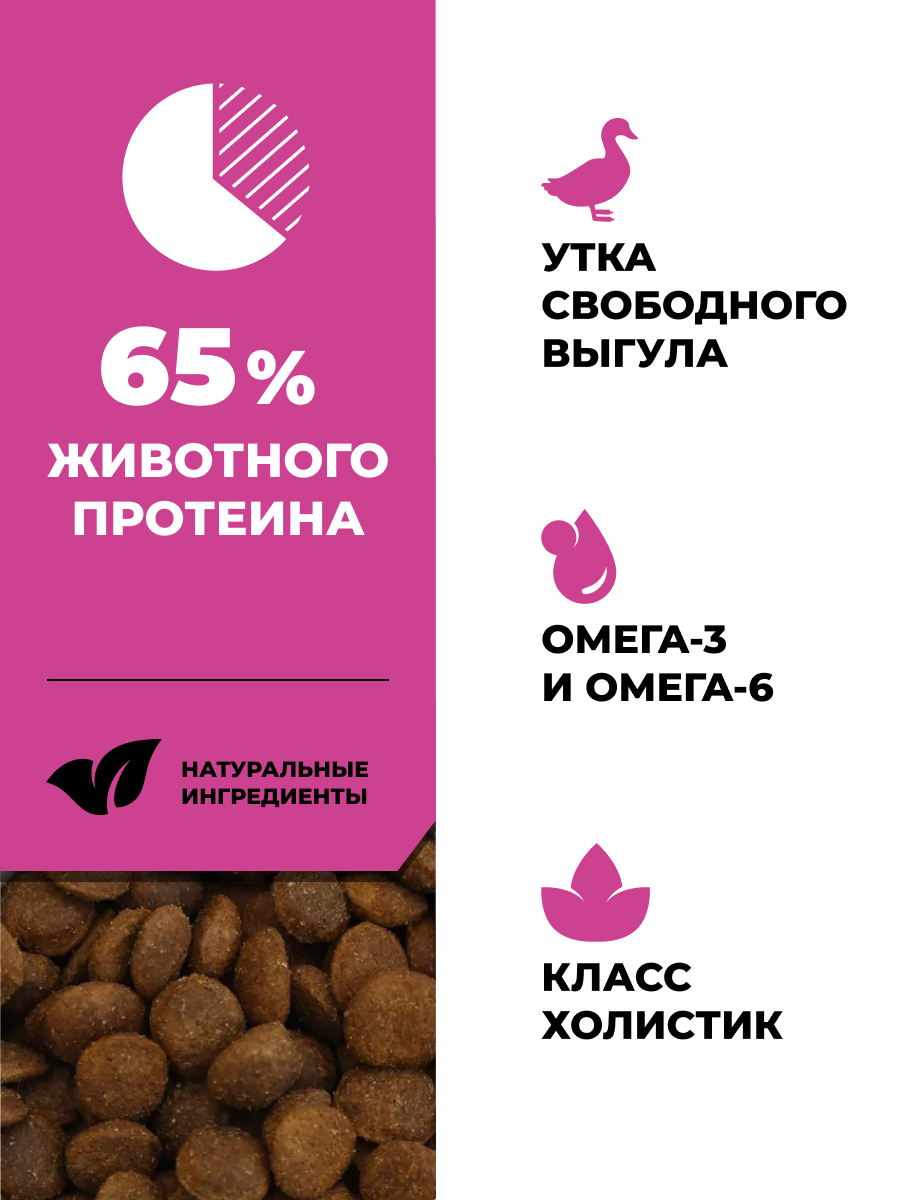 ⸙Разработан специально для собак с чувствительным пищеварением и особыми потребностями в питании; ⸙ Единственный источник животного белка – мясо утки; ⸙ Не содержит субпродуктов, красителей и гормонов роста; ⸙ Не содержит пшеницу, кукурузу, сою.