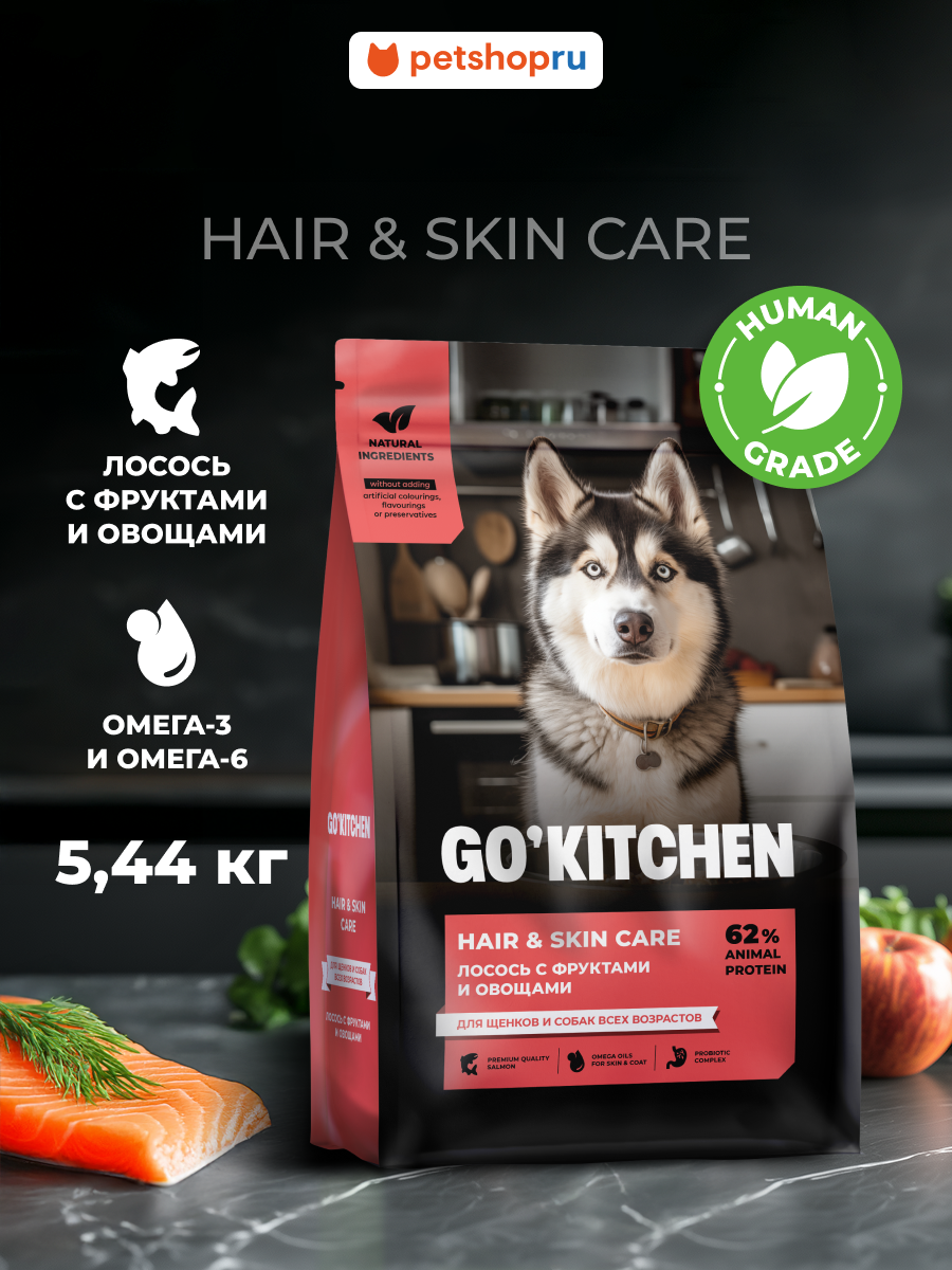 GOKITCHEN HAIR+SKIN CARE Salmon - полнорационный корм для щенков и собак всех возрастов, разработанный специально для поддержания здоровья кожи и шерсти.