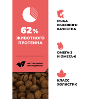 - Лосось и морская рыба - высококачественные источники животного белка, Омега-3 жирных кислот и ценных минералов для здорового роста, блестящей шерсти и крепкого иммунитета.