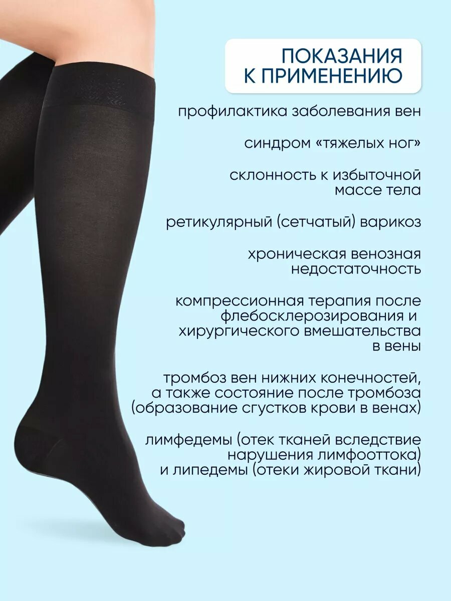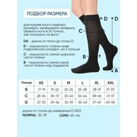 Особенности: • универсальные для мужчин и женщин; • класс компрессии - 1 класс (18–21 мм рт. ст.); • высота изделий: L-Long (40–44 см); • мягкий шов в области мыска; • повышенную износоустойчивость; • высокие влаго и воздухопроницаемость обеспечиваются за счет повышенной капиллярности волокон; • плоские швы; • степень компрессии уменьшаются снизу вверх; • стопа универсальная для размеров с 36 по 43; • цвет: карамель. Показания к применению: • профилактика заболеваний вен; • синдром «тяжелых ног»; • склонность к избыточной массе тела; • компрессионная терапия после флебосклерозирования и хирургического вмешательства на вены; • тромбоз вен нижних конечностей, а также состояние после тромбоза (образование сгустков крови в венах); • хроническая венозная недостаточность; • ретикулярный (сетчатый) варикоз; • лимфедемы (отек тканей вследствие нарушения лимфооттока) и липедемы (отеки жировой ткани); • перед применением проконсультируйтесь со специалистом. Противопоказания: Абсолютные: • нарушение кровообращения в артериях нижних конечностей; • сердечная легочная недостаточность; • синий болевой флебит; • кожные сыпи (дерматиты); • диабетическая полинейропатия; • хронический полиартрит. Относительные: • индивидуальная непереносимость материала компрессионных изделий. Как подобрать размер изделия: Для подбора необходимого размера изделия воспользуйтесь размерной таблицей, предварительно измерив / уточнив все необходимые параметры. 1. Размер изделия подбирается строго по индивидуальным анатомическим меркам. 2. Верхний край медицинского компрессионного трикотажа должен располагаться на 5–10 см выше уровня пораженной вены. • AD - длина от пятки до точки D; • D - окружность голени ниже подколенной складки на 2 пальца; • C - окружность самой широкой части голени; • B - окружность самой узкой части голени над ложыжками. В случае неправильного определения размера производитель не гарантирует полноценную функциональность изделия. Инструкция по применению Инструкция по надеванию медицинского компрессионного трикотажа Руками: 1. Изделие желательно надевать утром. Убедитесь, что Ваши ногти аккуратно пострижены, кольца сняты; 2. Надевать изделие, сидя на кровати, диване и т. п. Нога должна быть согнута в колене перед собой. 3. Изделие на лицевой стороне. 4. Вставить руку до пяточной части, изнутри прихватить пятку пальцами, вывернуть наизнанку только до пятки, расправить. 5. Вставить два больших пальца внутрь вывернутого изделия, растянуть его как можно шире в стороны. 6. Подтянуть за пяточную часть изделия, совместить её с пяткой ноги, зафиксировать в таком положении, наступив на пятку. 7. На уровне середины стопы сделать небольшую складку на изделии, глубоко захватить её пальцами рук с двух сторон, подвинуть к подъему, растянуть как можно шире, упершись в пятку (кому как удобно: либо обоими большими пальцами, либо нижней частью ладоней), обогнуть пятку растянутым изделием, протянуть до уровня щиколотки, расправить край. 8. Далее, порциями (примерно по 5 см) прихватываем изделие, растягиваем, расправляем край от морщин. Когда будет видна стопа, убедиться, что пяточная часть изделия занимает правильное положение. Если пяточная часть сместилась, то прихватить её пальцами, оттянуть и зафиксировать правильно. С помощью батлера: 1. Поставьте батлер на пол