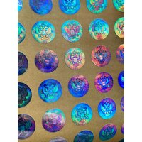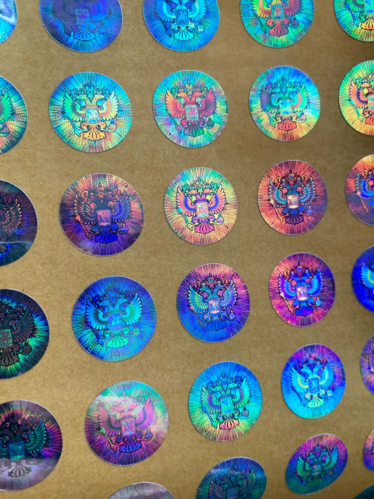 Голограмма это наклейка которая наносится на документы или продукцию. Наклейки с голографическим фоном или изображением и прозрачный ламинат эффективные средства защиты документов и товаров от подделки и оригинальный маркетинговый ход. Голографический ламинат сделан из полимерных материалов. Голографическая наклейка имеет особенный дизайн и форму. Голографическая марка используется для защиты таких важных документов как паспорт, удостоверение, пропуск. Голограммы на справки и мед книжки используются в мед. учреждениях. Купить галограммы защитные можно для повышения имиджа продукции. Использование голографических этикеток на товарах придает им необычный дизайн. Стандартные голограммы можно использовать на упаковке, чтобы предотвратить преждевременное вскрытие. Голограмма Герб РФ имеет диаметр 15 мм, цвет серебро