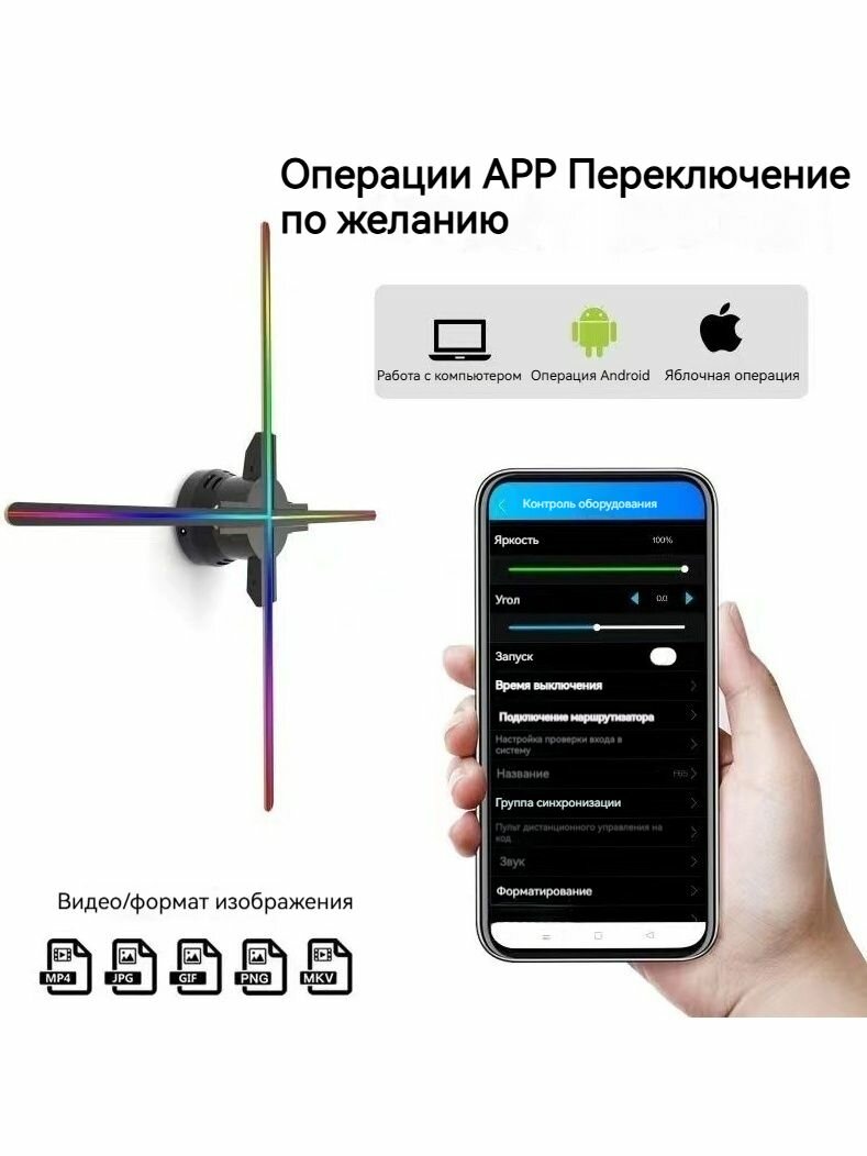 Особенности голографического проектора 3D fan: Благодаря использованию светодиодных ламп высокой яркости, разрешению 2000 * 1152 пикселей, диаметру дисплея 48,7 см, углу обзора 180° рекламный аппарат может отображать яркие 3D-изображения, создается впечатление, что он полностью парит в воздухе, привлекая внимание людей и достигая отличные рекламные результаты. Поддерживаемые форматы контента: Поддержка обычного отображения видео, анимации и изображений. Поддерживаемые форматы: MP4 / AVI / GIF / JPG / PNG. Программное обеспечение совместимо с Windows 7 / Windows 10 (лучше использовать черный фон). Дистанционное управление: Включает в себя пульт дистанционного управления для управления дисплеем, вы можете регулировать яркость, скорость, переключать различные режимы и включать / выключать его. Широкий спектр применения: Голографический вентилятор подходит для использования внутри помещений. При использовании на открытом воздухе, пожалуйста, надевайте защитный чехол. Рекомендуется устанавливать изделие на стене высотой не менее 3 метров. Пожалуйста, не прикасайтесь к лопасти вентилятора во время его работы. Он широко используется в выставочных залах, экспозициях, торговых центрах, универмагах и аэропортах. Привлекайте внимание людей и позволяйте вам быстро публиковать и распространять рекламный контент о продуктах. Оборудование включает в себя Голографическая рекламная машина x 1 Стационарная подвесная рекламная машина x 1 Пульт дистанционного управления x 1 Винт x 1 Руководство пользователя x 1 Адаптер питания x 1