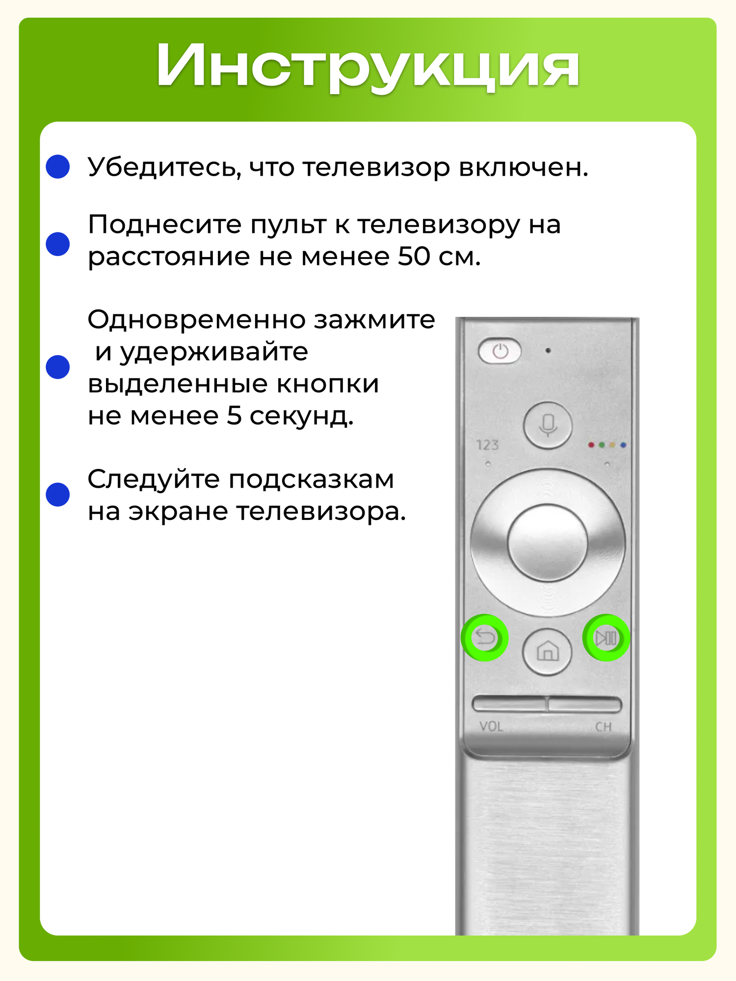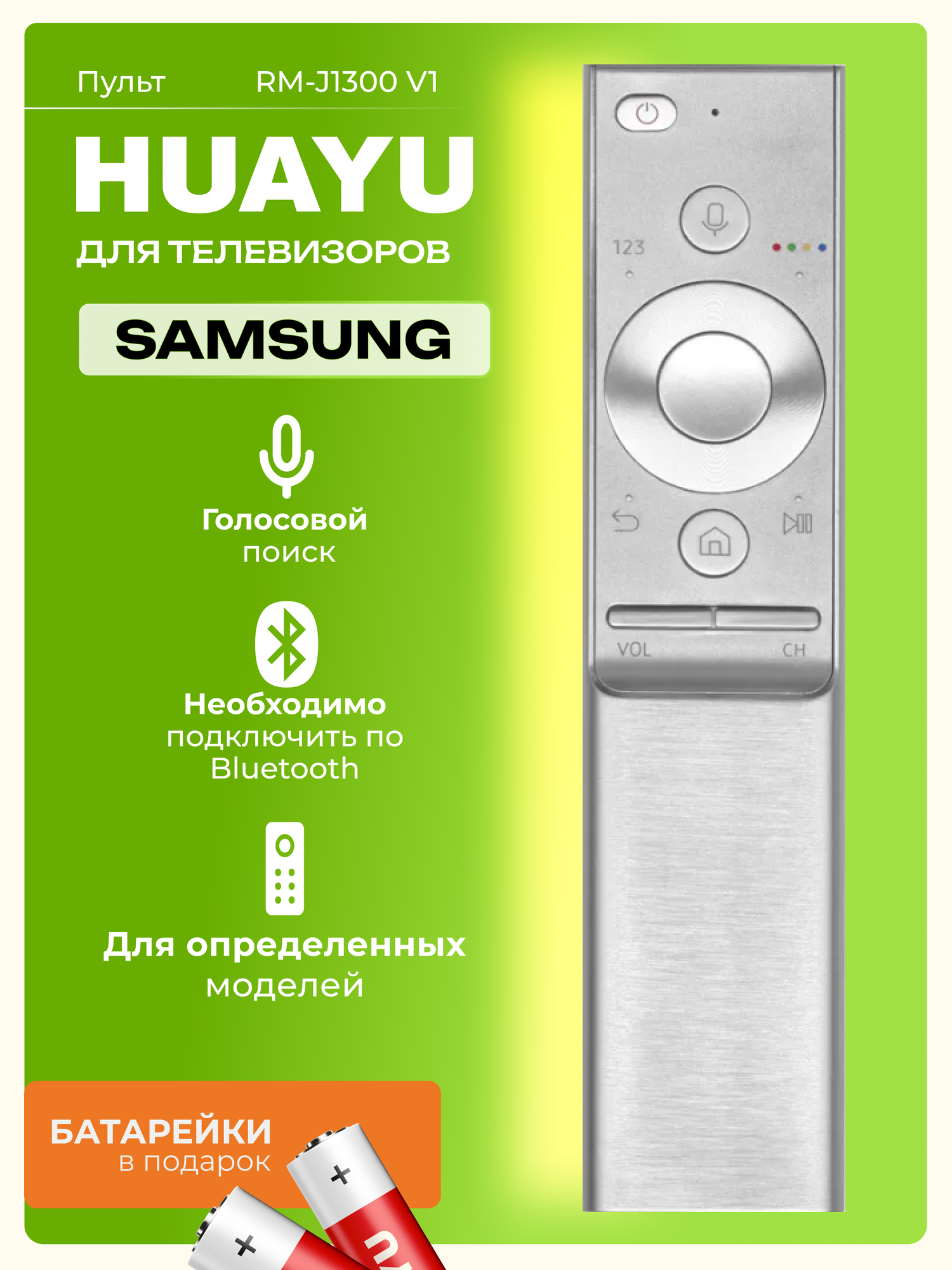 Голосовой телевизионный пульт дистанционного управления HUAYU RM-J1300V1 для Smart телевизоров Samsung / Самсунг выпущенных с 2018 года и поддерживающих голосовые пульты (голосовой пульт должен был идти в комплекте с ТВ). Для работы пульта ДУ необходимо произвести его сопряжение с телевизором, инструкция по настройке представлена на дополнительном фото. Выбирайте этот ПДУ, если он устраивает Вас по функционалу и внешнему виду, рекомендуется для замены пультов в схожих корпусах, для Вашего удобства. ПДУ подойдет на замену многих голосовых SMART пультов: BN59-01242A, BN59-01242C, BN59-01265A, BN59-01266A, BN59-01270A, BN59-01274A, BN59-01278A, BN59-01290A, BN59-01298G, BN59-01300F, BN59-01300G, BN59-01300J, BN59-01309B, BN59-01311B, BN59-01311G, BN59-01311H, BN59-01312B, BN59-01312H, BN59-01312R, BN59-01335B, BN59-01336B, BN59-01350J, BN59-01357B, BN59-01357C, BN59-01357H, BN59-01363G и другие. Обратите внимание, некоторые функции могут быть недоступны с вашей моделью ТВ, если на родном пульте не было таких кнопок. RM-J1300V1 произведен в соответствии с высокими мировыми стандартами качества и безопасности, что подтверждается соответствующей сертификацией товаров HUAYU и станет прекрасной заменой сломанного или утерянного пульта.