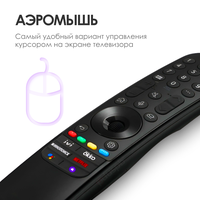 Универсальный пульт Magic Remote для телевизоров LG автоматически определяет большинство устройств, просто настраивается и подключается к телевизору. Вы можете использовать голосовые команды, управление по аналогии с мышью и интерактивное колесико для выбора развлечений и управления умным домом без использования flash-носителей.