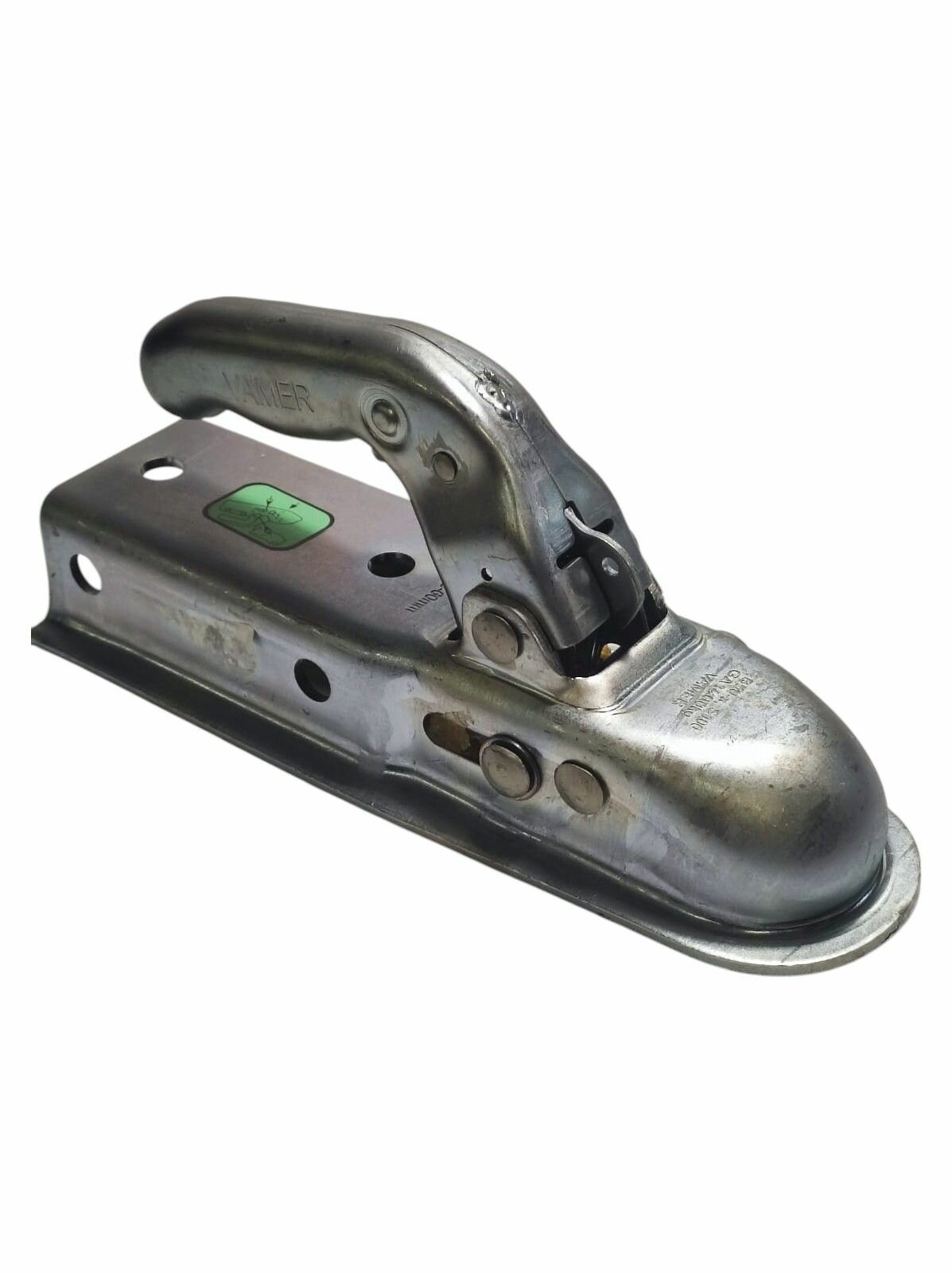 Сцепная головка под шар фаркопа ISO / 50 мм. Прицепное устройство для прицепа в снятом с фаркопа состоянии имеет опущенную ручку, указатель на индикаторе сбоку указывает на минус в красном квадрате.