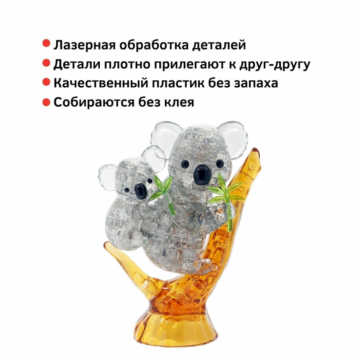 Коалы - милые и очень храбрые зверьки из Австралии. Они способны пребывать в неподвижном состоянии по 16 часов в сутки, но если им грозит опасность, они тут же выпускают коготки! Соберите полупрозрачную фигурку мамы-коалы с детенышем. Клей не понадобится, объемные детали крепятся друг к другу по принципу обычного пазла, а в конце фигура закрепляется штифтом и становится прочной. Не забудьте положить в лапки коал бамбуковые веточки. Crystal Puzzle - бренд из Гонконга, ассортимент которого постоянно пополняется новинками. Необычные пазлы продаются во всем мире. Детали пазла упакованы в плотный пакет – они не потеряются и не сломаются. Также в наборе есть инструкция с порядком сборки деталей. Подбирайте детали по изображениям, и вы быстро соберёте пазл. В каждом наборе вы найдете подробную инструкцию по сборке на русском языке. Обратите внимание, что фигурка становится прочной после окончательной сборки. Головоломки Crystal Puzzle обожают собирать и взрослые и дети, это отличный семейный досуг.
