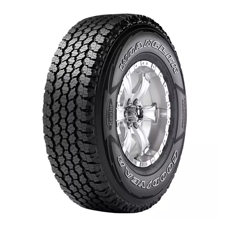 Одной из отличительных особенностей протектора шины Goodyear Wrangler All-Terrain Adventure with Kevlar является то, что его дизайн обладает куда большей производительностью вне дорог, чем на них. Как и у внедорожных моделей, он содержит большое количество отдельных блоков, отстоящих друг от друга на значительном расстоянии, сгруппированных в пять продольных ребер. Наличие этих составных элементов улучшает устойчивость на высокой скорости, а также способствует более быстрым и точным реакциям шины на повороты руля. В то же время многочисленные блоки образуют в процессе движения множество разнонаправлено расположенных кромок сцепления, что обеспечивает уверенное поведение на проселочных и скользких дорогах.