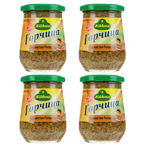 Состав набора: Горчица Kuhne Зернистая Ротиссер 250 мл - 4 шт Зернистая горчица, также известная многим как "rotisseur" (горчица для жареного мяса) - это крупномолотая острая горчица. Большая часть горчичных зерен остается целыми, поэтому при нагревании они придают блюду такой неповторимый вкус. Вот почему ее так любят подавать к горячим блюдам. Кроме этого, зернистая горчица является классическим дополнением к маринадам барбекю.