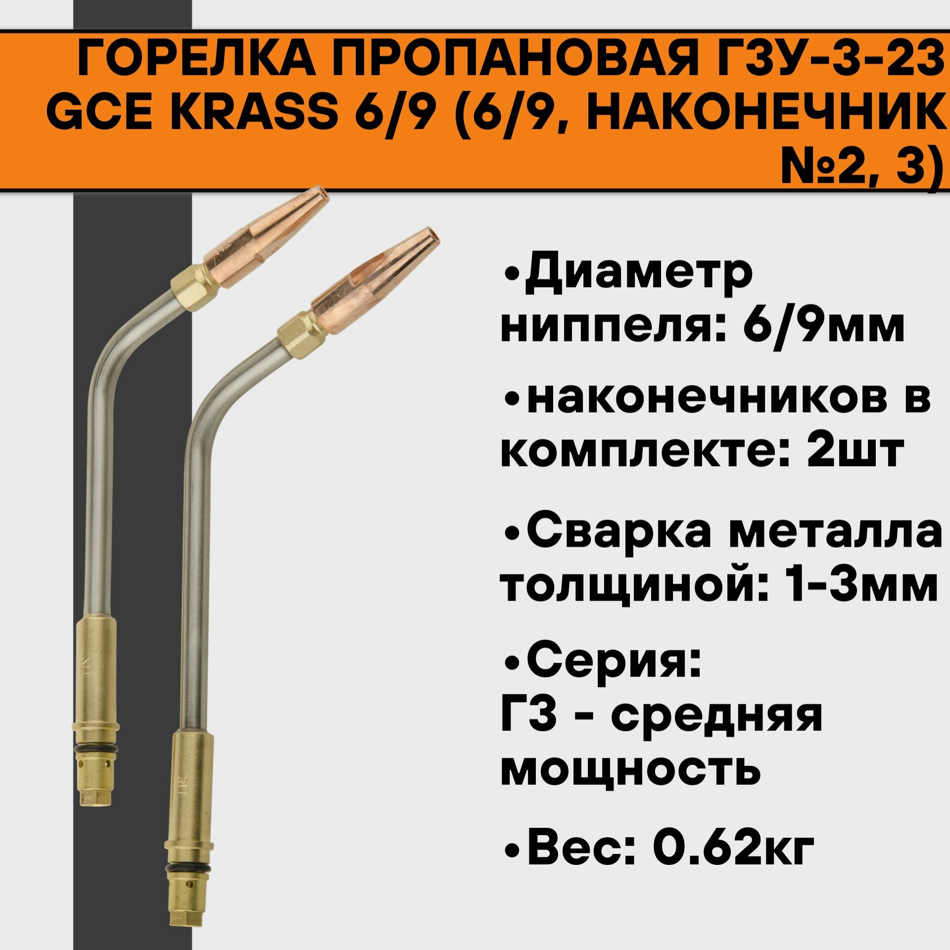 Горелка пропановая Г3У-3-23 6/9 (наконечник №2, 3) GCE KRASS предназначена для сварки, пайки высокотемпературными припоями, нагрева, плавления и других технологических процессов.