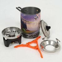 В комплекте: Котелок с радиаторным кольцом, крышка, горелка с пьезоподжигом, универсальный таганок, складная подставка для баллона, сетчатый чехол.