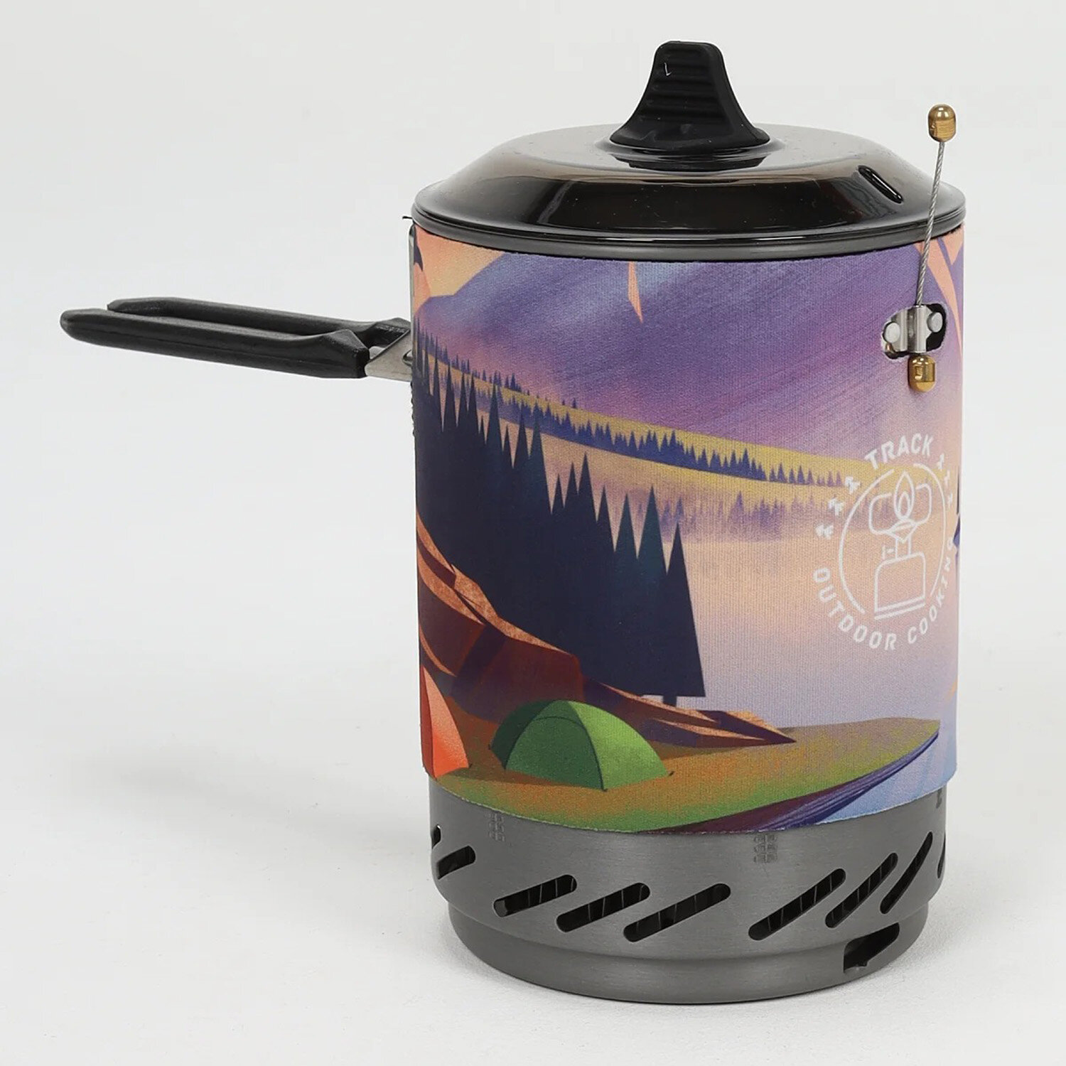 Алюминиевый котелок изолирован защитным чехлом из термопластичного эластомера, что еще увеличивает энергоемкость системы, дольше сохраняет воду горячей и предохраняет руки пользователя от ожогов.