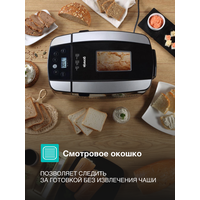 Поддержание температуры после выпекания; Индикация включениявремени приготовления; Дисплей; Прорезиненные ножки; Окно контроля процесса; Звуковой сигнал; Сохранение программы при сбое электропитания; Отсек для сетевого шнура; Программы хлебопечения: безглютеновый хлеб/бородинский хлеб/ржаной хлеб/багет; Программы приготовления: варенье/кекс/подогрев/тесто; Дополнительно в комплекте: книга рецептов, мерный стакан, мерная ложка