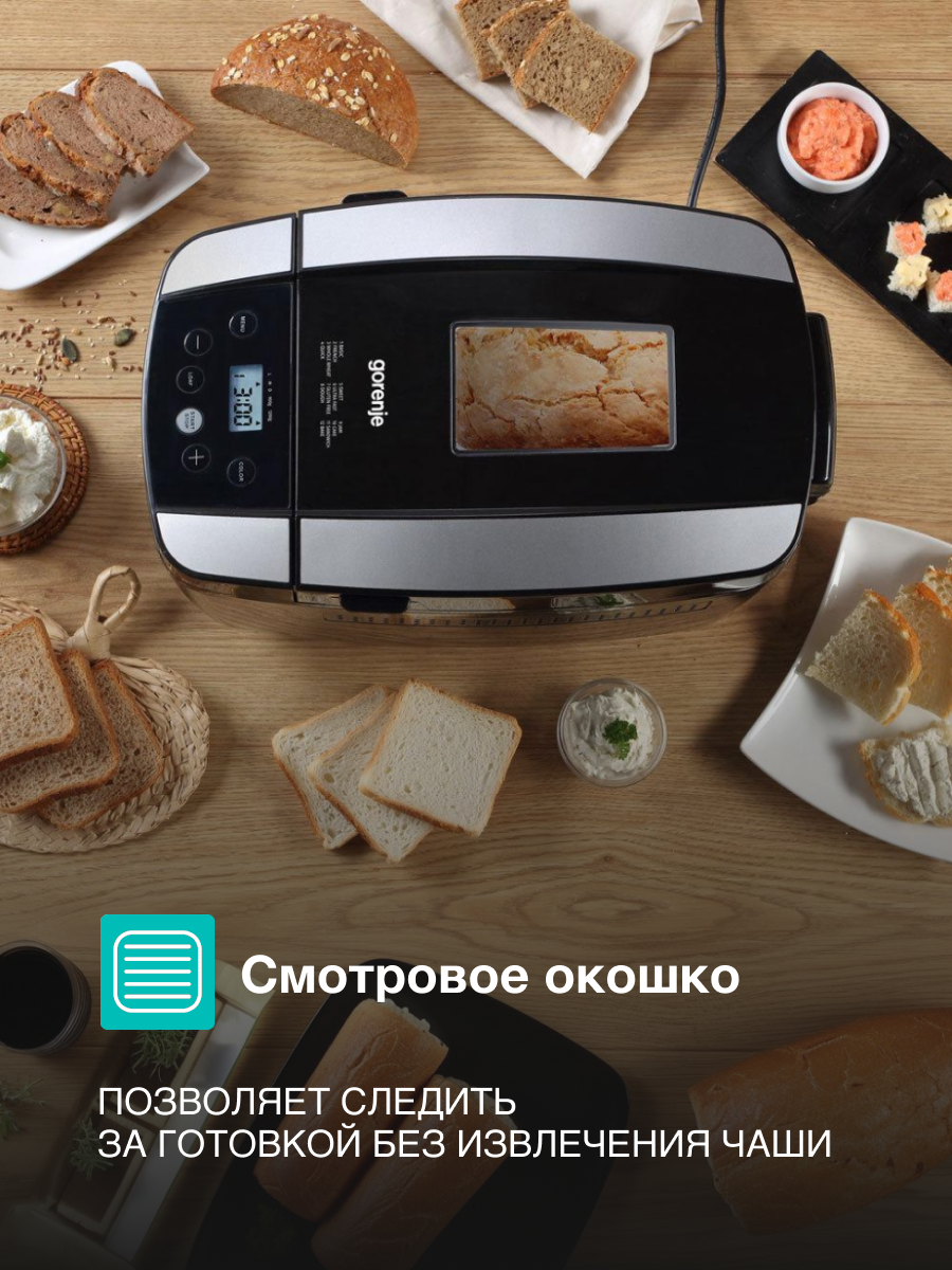 Без глютена Не отказывайте себе в удовольствии Gorenje позаботилось также о тех, кто употребляет хлеб без глютена. Из-за особенностей безглютеновой муки, которая дольше подходит и выпекается, мы добавили программу «Без глютена». Для приготовления отличного хлеба без глютена в хлебопечи не требуется дополнительно вымешивать тесто вручную. Время выпечки по сравнению с обычными типами муки дольше.