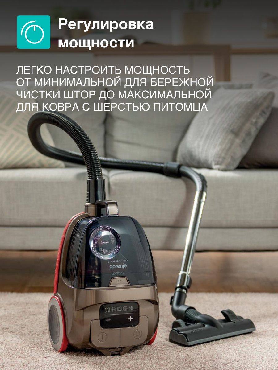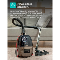 Регулировка мощности выполняется с помощью сенсорного управления на корпусе. В пылесосе предусмотрена автоматическая смотка сетевого шнура.