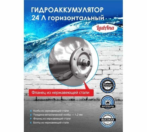 Гидроаккумулятор горизонтальный из нержавеющей стали 24 л т.м. LadAna 110108005- предназначен для поддержания давления в системах водоснабжения, компенсации гидроударов и накопления воды.