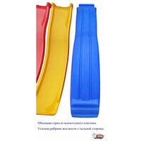 Горка объемная Усиленная (Волновой скат - длина 2,45 м.). Данное изделие пригодно для использования как на улице, так и в помещении. Изготовлено - всепогодный полиэтилен с Уф-стабилизированным красителем. Данное изделие нужно устанавливать на игровую раму, подходящую для данного вида деятельности (например на металлическую или деревянную игровую опорную башню). При сборке нужно исключить возможность защемления головы, пальцев или одежды. Чтобы предотвратить падение и защемление одежды во время движения, нельзя оставлять зазоры от 3 мм до 25 мм. Сборку нужно осуществлять, используя винты с потайной или полукруглой головкой. Ровная поверхность площадки должна быть устойчивой, чтобы избежать падения или повреждения горки. Настоятельно рекомендуется не поднимать горку снизу, после того, как она зафиксирована на платформе. Так можно повредить или сломать горку. Во время монтажа и сборки изделия особое внимание нужно уделять минимальному требуемому расстоянию между изделием и очевидным препятствием: Стены, ограждения и так далее. Это расстояние должно составлять минимум 2 000 мм. В этой зоне безопасности не должны находиться твердые, угловатые или заостренные предметы. Поверхность земли под горкой должны быть плоской, и ударопоглощающей, это не должен быть асфальт, ни бетон и никакая другая твердая поверхность.