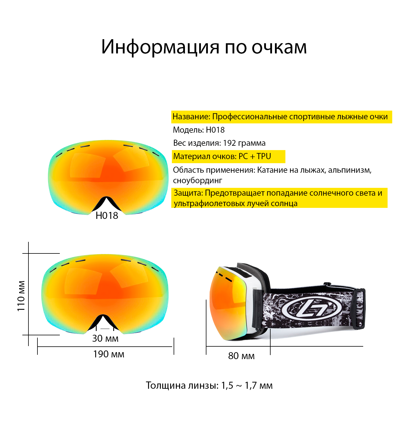 Горнолыжные очки H18 с защитой (UV400) от ярких солнечных лучей, антибликовый эффект, противотуманная защита. Съемная линза. Цвет линзы желто-красный.: сравнение цен, характеристики, фото, актуальное наличие и цены.