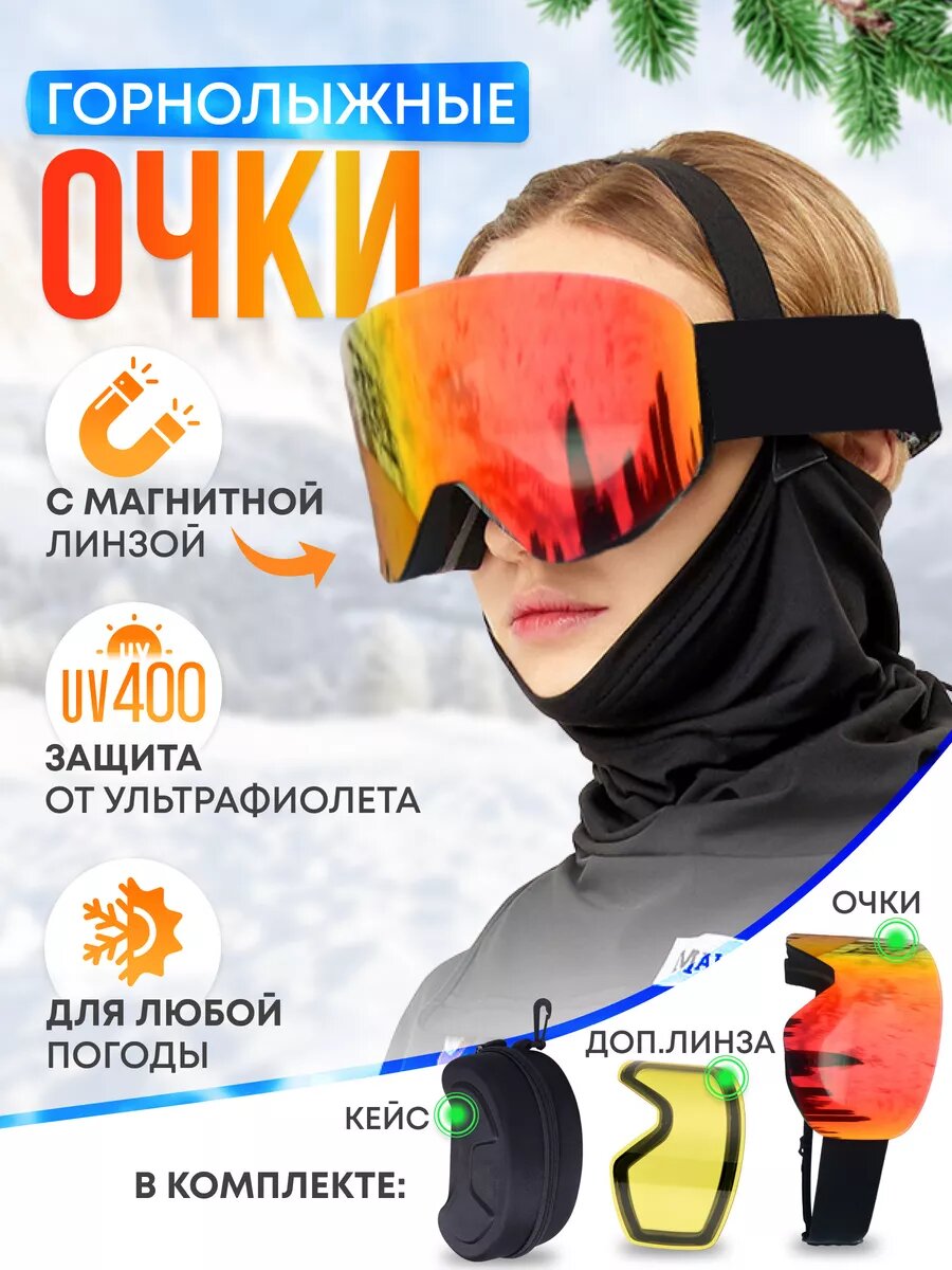 Горнолыжная маска с двойной магнитной линзой, жестким кейсом для переноски и дополнительной линзой для пасмурной погоды. Две линзы в комплекте позволят кататься в любую погоду в горах не только на горных лыжах и сноуборде, но и на снегоходе, беговых лыжах и мотокроссе. Благодаря магнитам замены линзы займет не более 5 секунд. Спортивные горнолыжные зимние очки обладают цилиндрическими линзами с широким углом обзора, стильным дизайном, 100% защита от ультрафиолета, не запотевает. Лыжные очки совместимы почти со всеми горнолыжными шлемами. Универсальный размер подойдет для мужчин и женщин (мужские, женские, подростковые). Другие особенности аксессуара: Антибликовое покрытие, устойчивое к царапинам - Двойной поролоновый слой + слой из мягкой ткани в местах прилегания к лицу. Удобная регулировка размера. Вентиляционные отверстия в линзе препятствующие запотеванию. Противоскользящий силиконовый слой на обратной стороне стрепа. Напыление со 100% защитой от ультрафиолетового излучения. Возможность использования с очками. Лучшее соотношение цена-качество для данной модели маски для горных лыж и сноуборда.