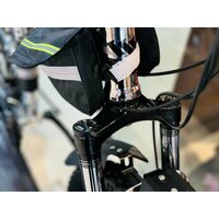 Велосипед частично разобран: снято переднее колесо, руль, сиденье и подседельный штырь, педали, рога на руле, передний тормоз (тормозной диск и суппорт), крылья.