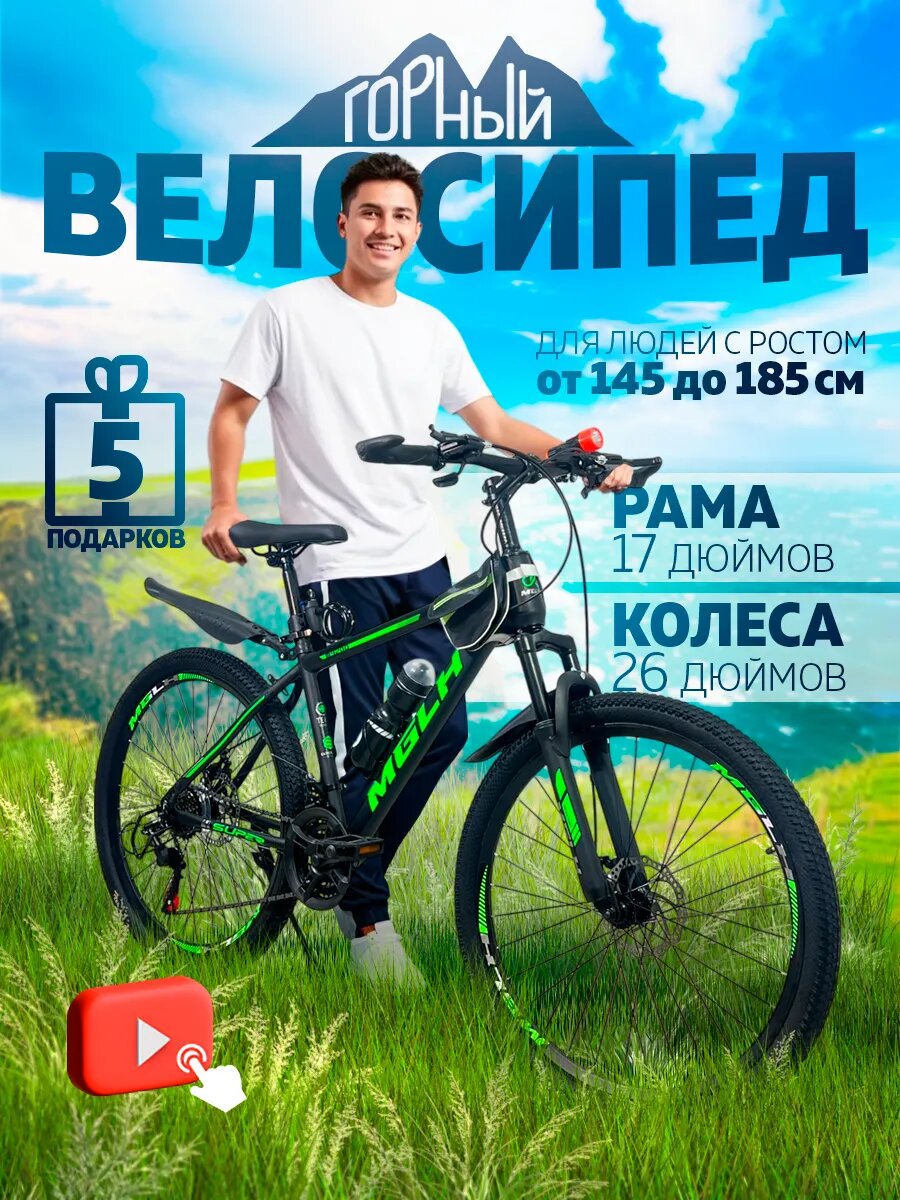 Горный велосипед скоростной, черно-зеленый, колёса — 26″, рама — 17″, 21 скорость: сравнение цен, характеристики, фото, актуальное наличие и цены.