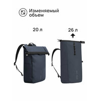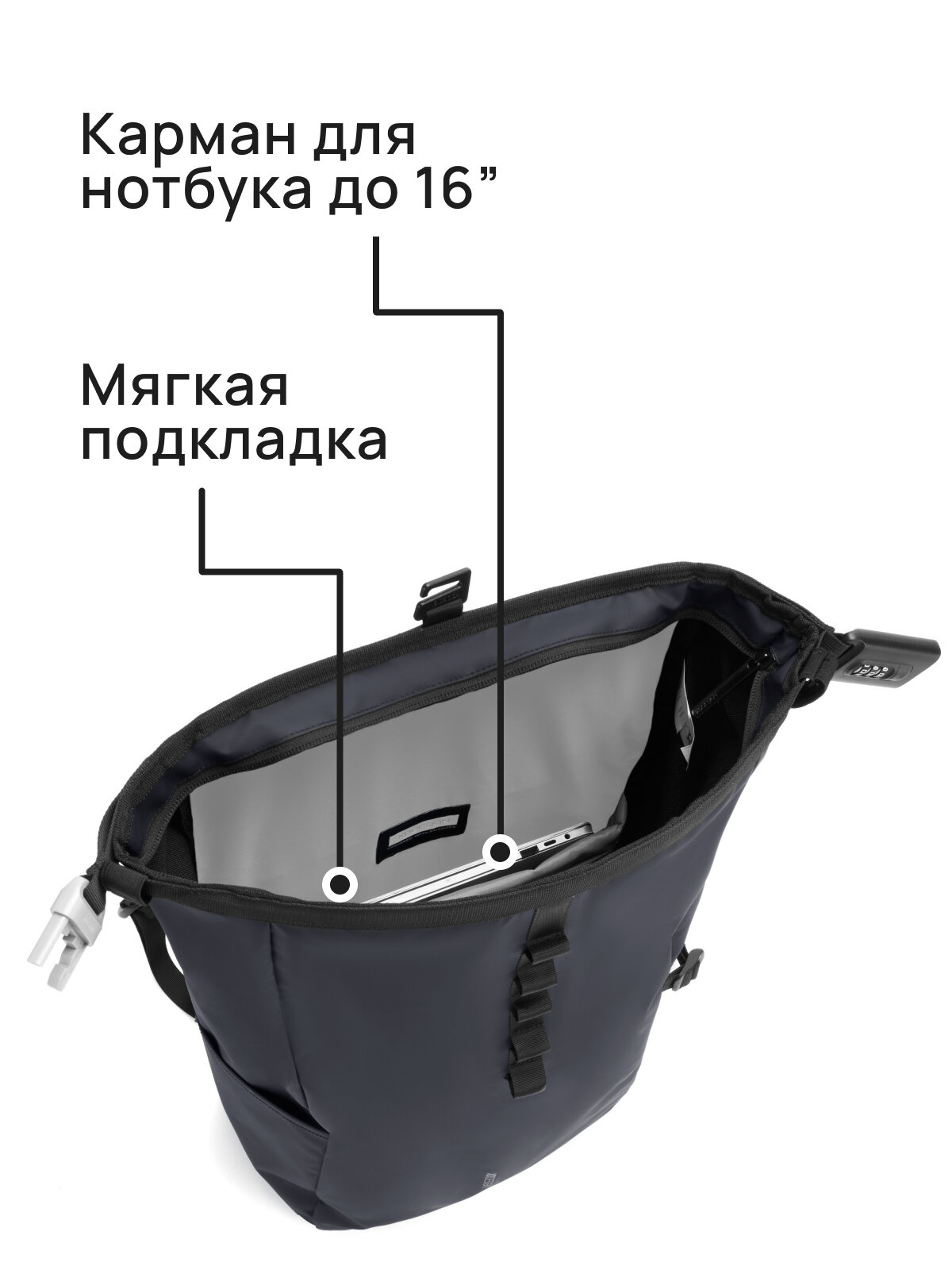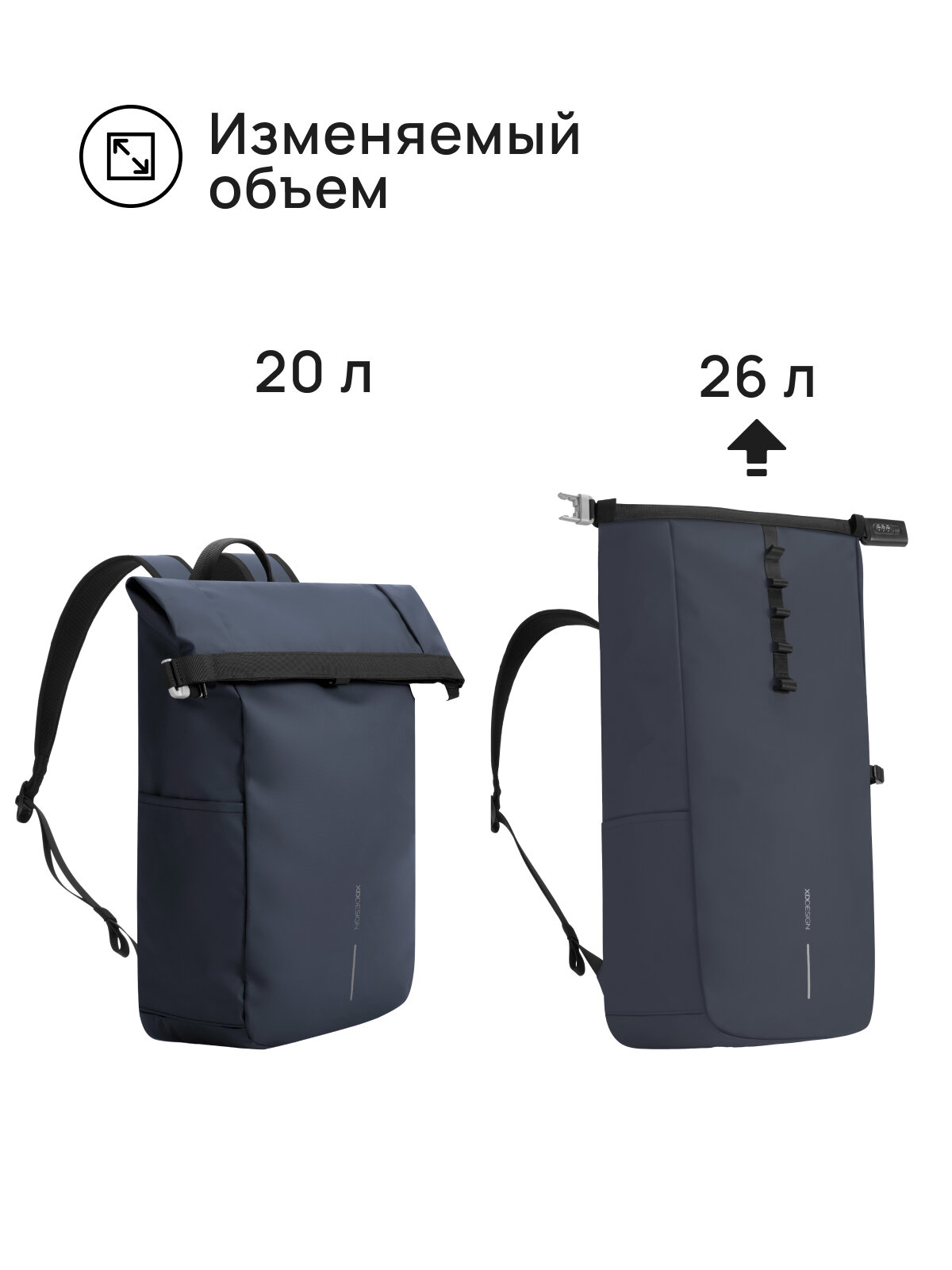 Городской рюкзак XD Design Urban Roll-top подойдет для переноски ноутбука до 16" и планшета до 12,9". Карманы для техники — с мягкой подкладкой для защиты гаджетов. Верх рюкзака сворачивается и застегивается на кодовый замок. Такая конструкция позволяет регулировать внутренний объем рюкзака с 20 до 26 л. Внешний материал — водоотталкивающий и прочный, защитит содержимое от любых погодных условий в ежедневных поездках и путешествиях. Размеры: 44–64 х 29,5 х 15 см.
