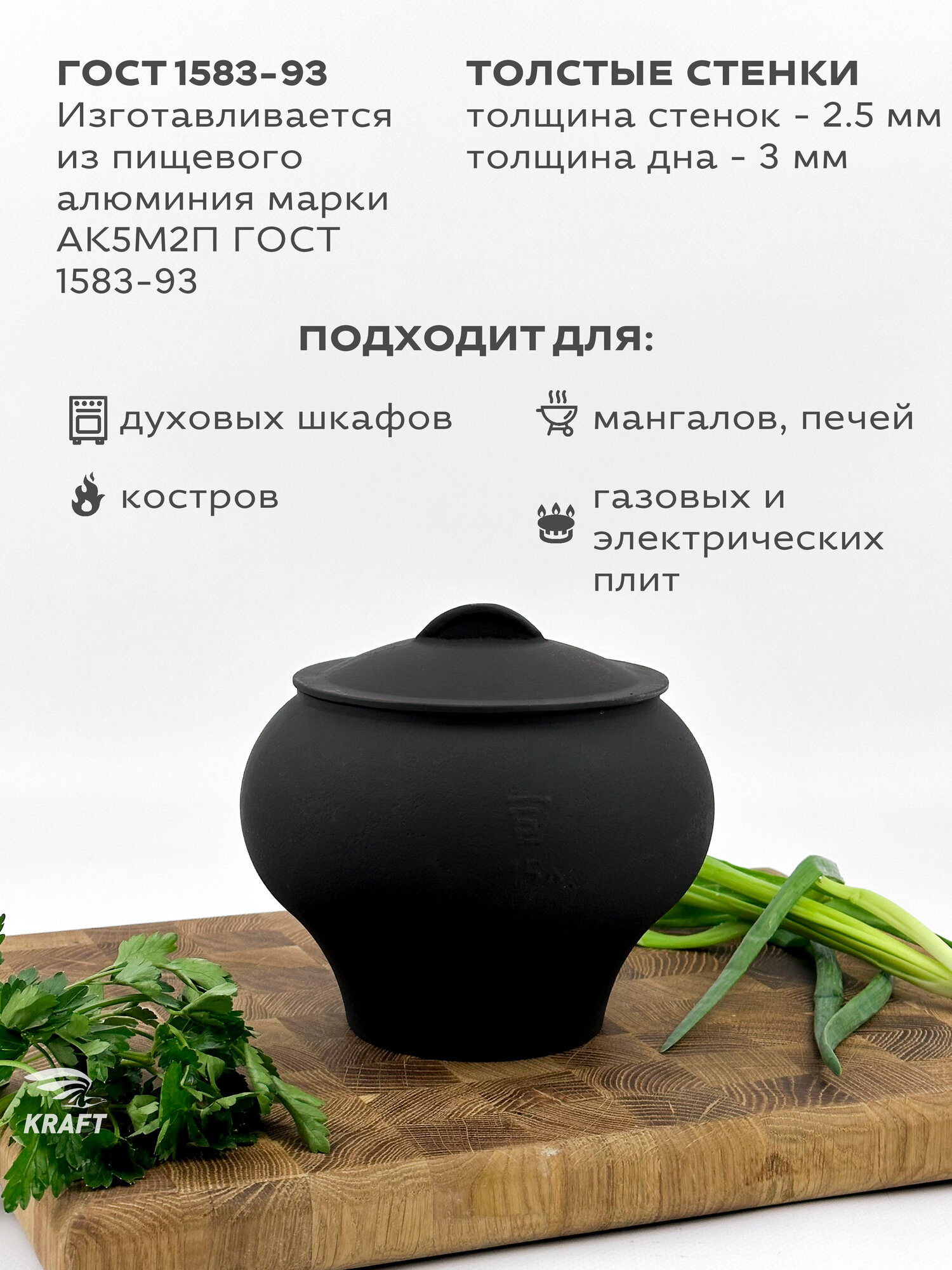 Горшок окрашенный термостойкой краской - идеальное решение для приготовления вкусных и полезных блюд на кухне. Изготовлен из высококачественного пищевого алюминия, обеспечивает равномерное распределение тепла, что позволяет приготовить пищу быстро и без особых усилий. Идеально подходит для различных блюд от плова и каши до запекания. Благодаря своей прочности и надежности, можно использовать на плите, в духовке, на костре или даже на открытом огне. Он не только функционален, но и прекрасно впишется в любой интерьер благодаря своему стильному дизайну. Кастрюля станет прекрасным подарком для любителей русской кухни или просто для тех, кто ценит качество и удобство посуды для приготовления пищи. Приготовьте вкусные и ароматные блюда в кастрюле изготовленной по ГОСТ Р 51162-98 из алюминиевых сплавов марки АК5М2П. Порадуйте своих близких незабываемыми кулинарными шедеврами! Не боится механических повреждений. Быстро нагревается. Экологично. Идеально для приготовления практически любых продуктов.