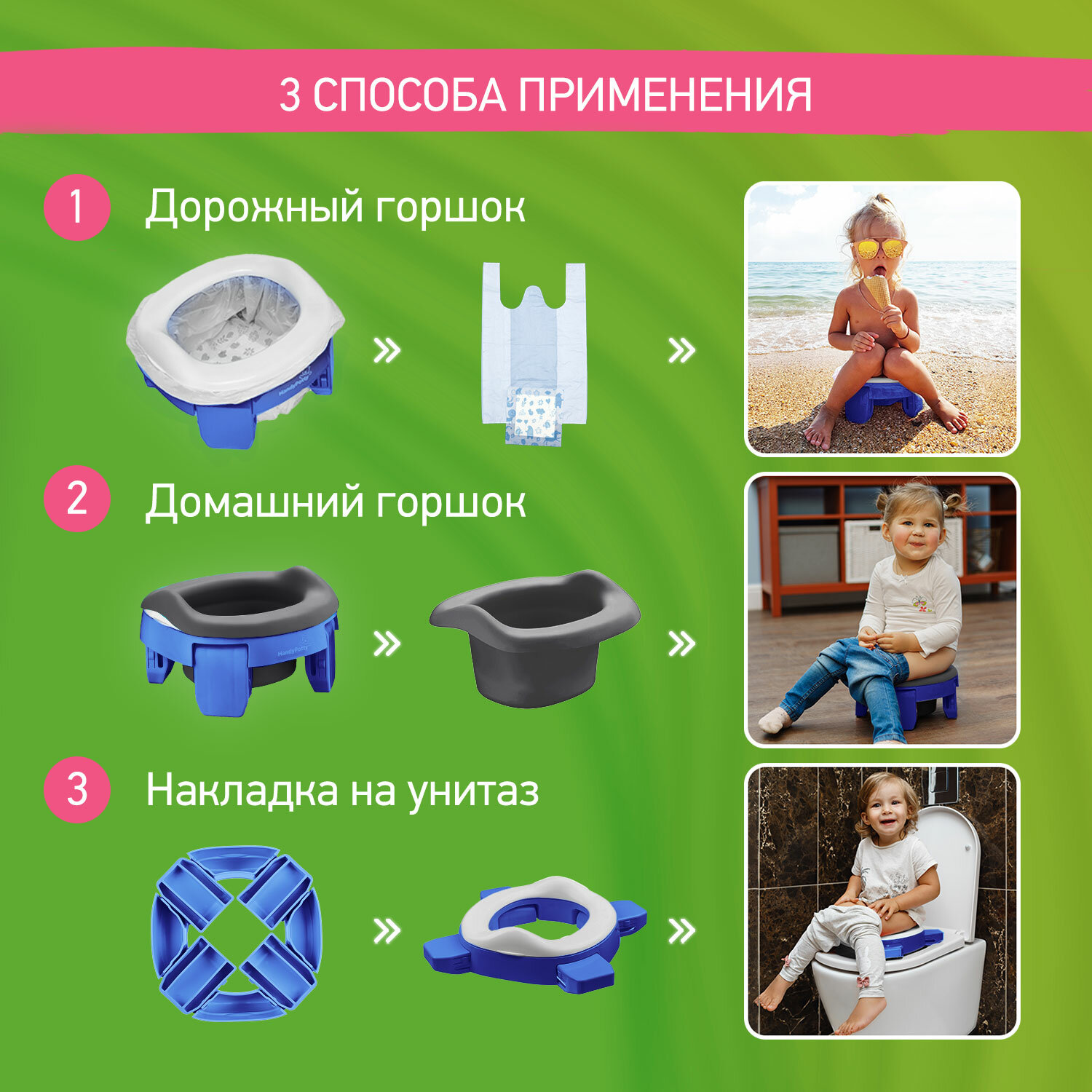 Этот горшок сочетает в себе функции трех аксессуаров: обычного горшка, дорожного горшка и адаптера для унитаза.