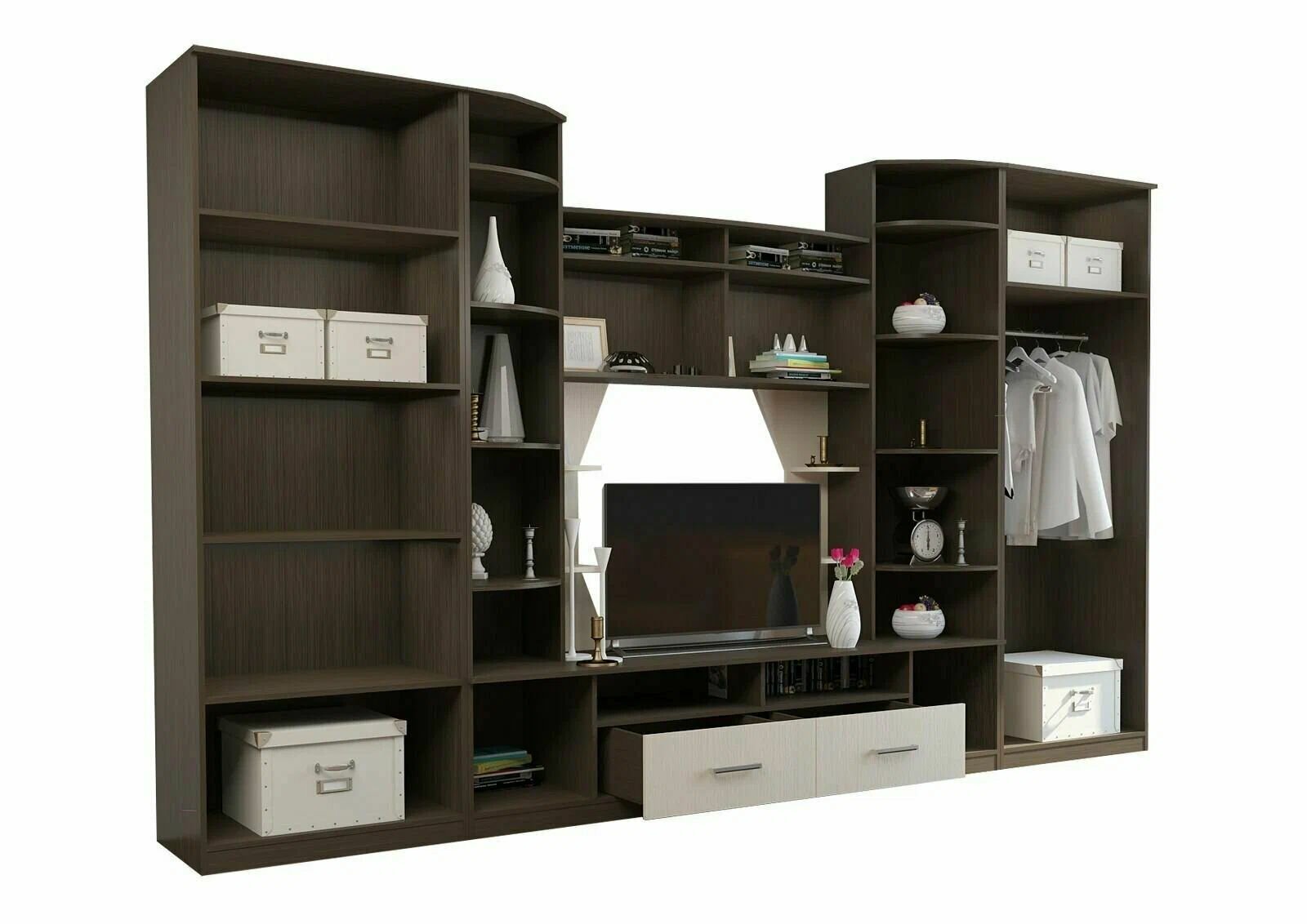 Гостиная Атланта отличное решение для загородного дома, квартиры, дачи. Большая стенка с платяным шкафом позволит хранить сезонные вещи и повседневную одежду на вешалках. Организация пространства – это конек данной модели, ведь в ней есть всевозможные варианты для хранения вещей: платяной шкаф, выдвижные ящики, множество открытых и закрытых полок и ниши под TV-оборудование. Использование качественных материалов и надежной фурнитуры станут залогом долговечного и приятного использования вашей новой гостиной.